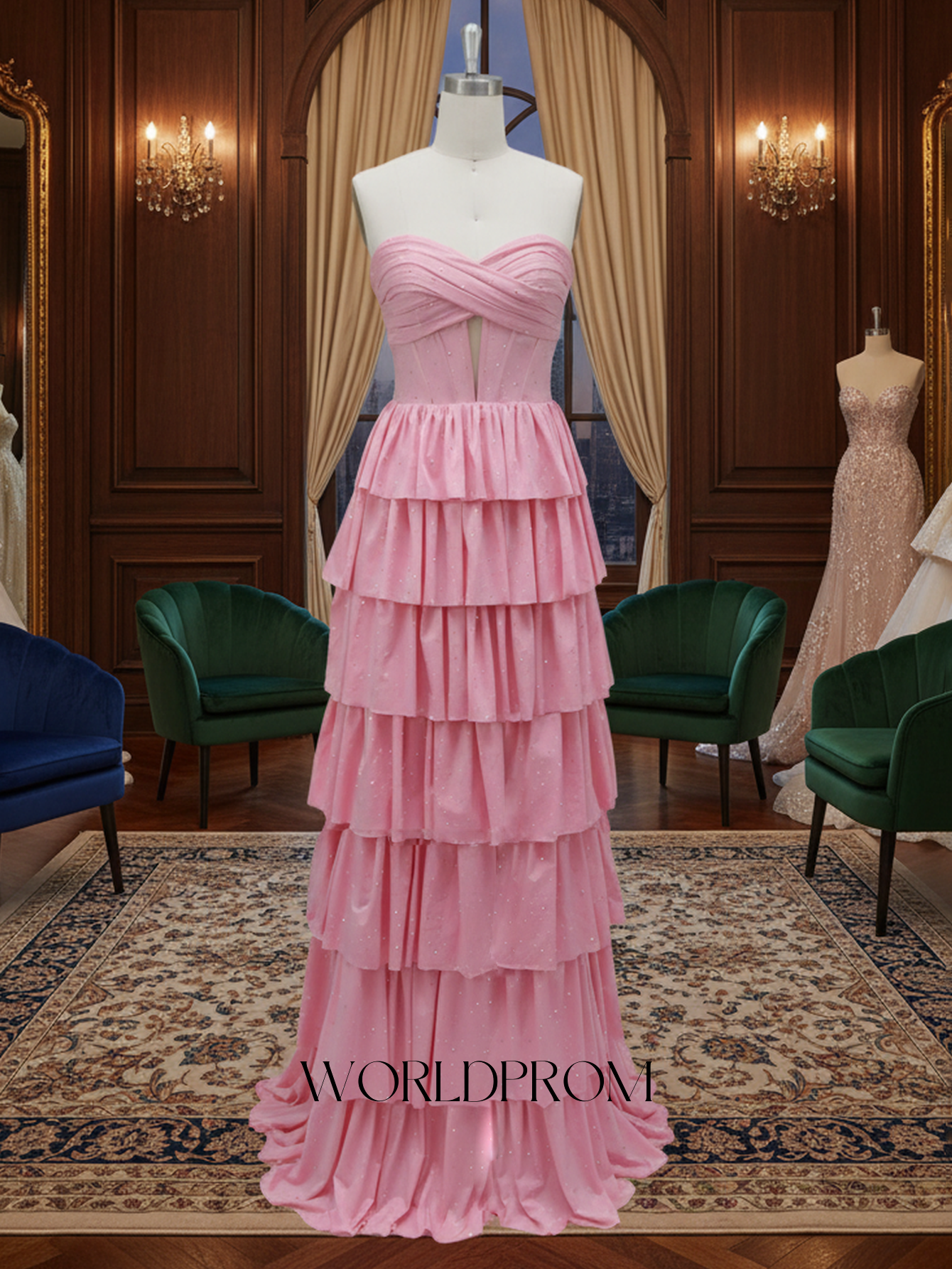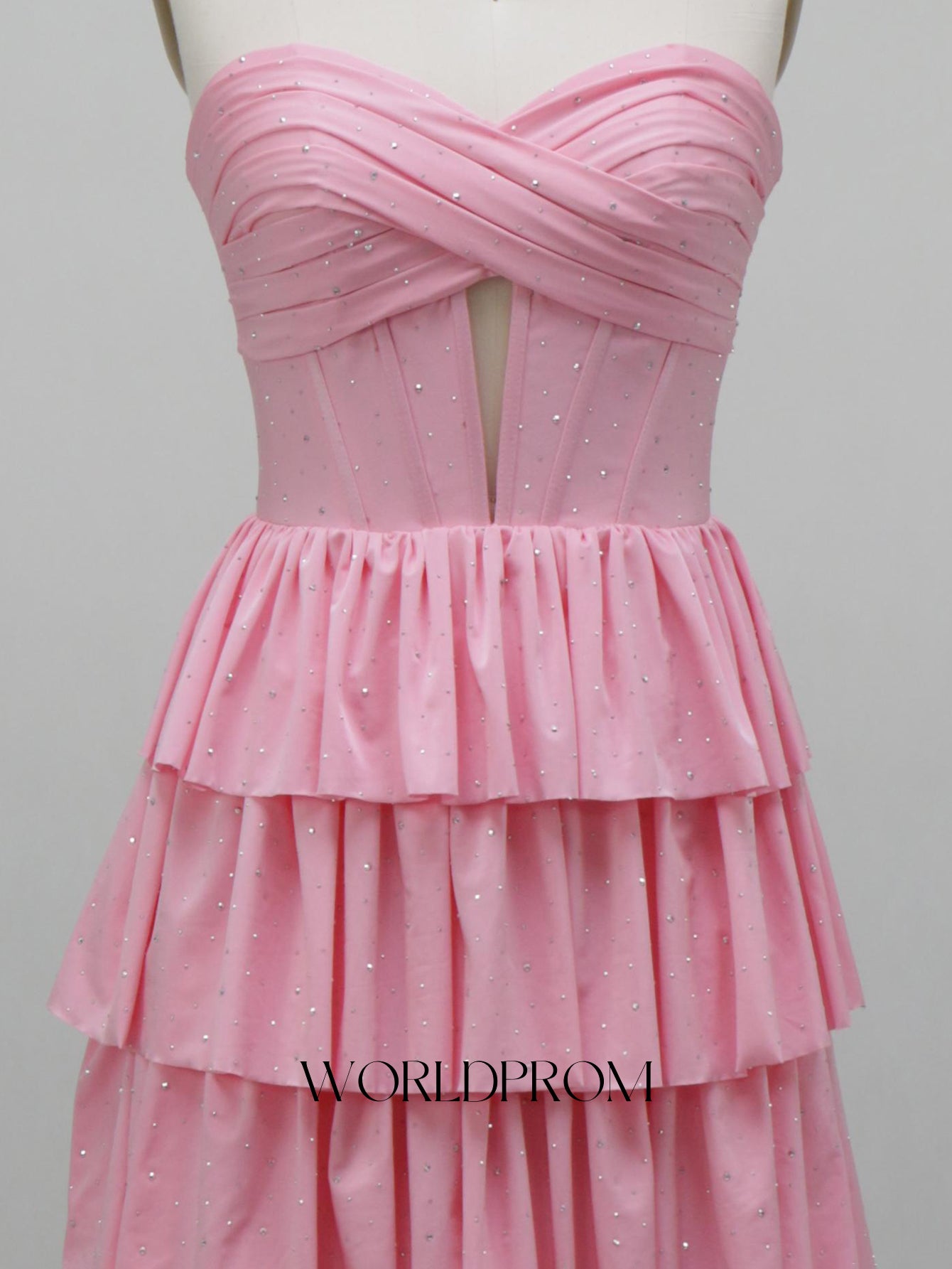 This satin prom gown features hot fix ruched bust with cut front on the bodice. The strapless crystal dress has a sweetheart neckline and ruffled hem. Worldprom a-line prom dresses are ideal for party, evening or festivals.