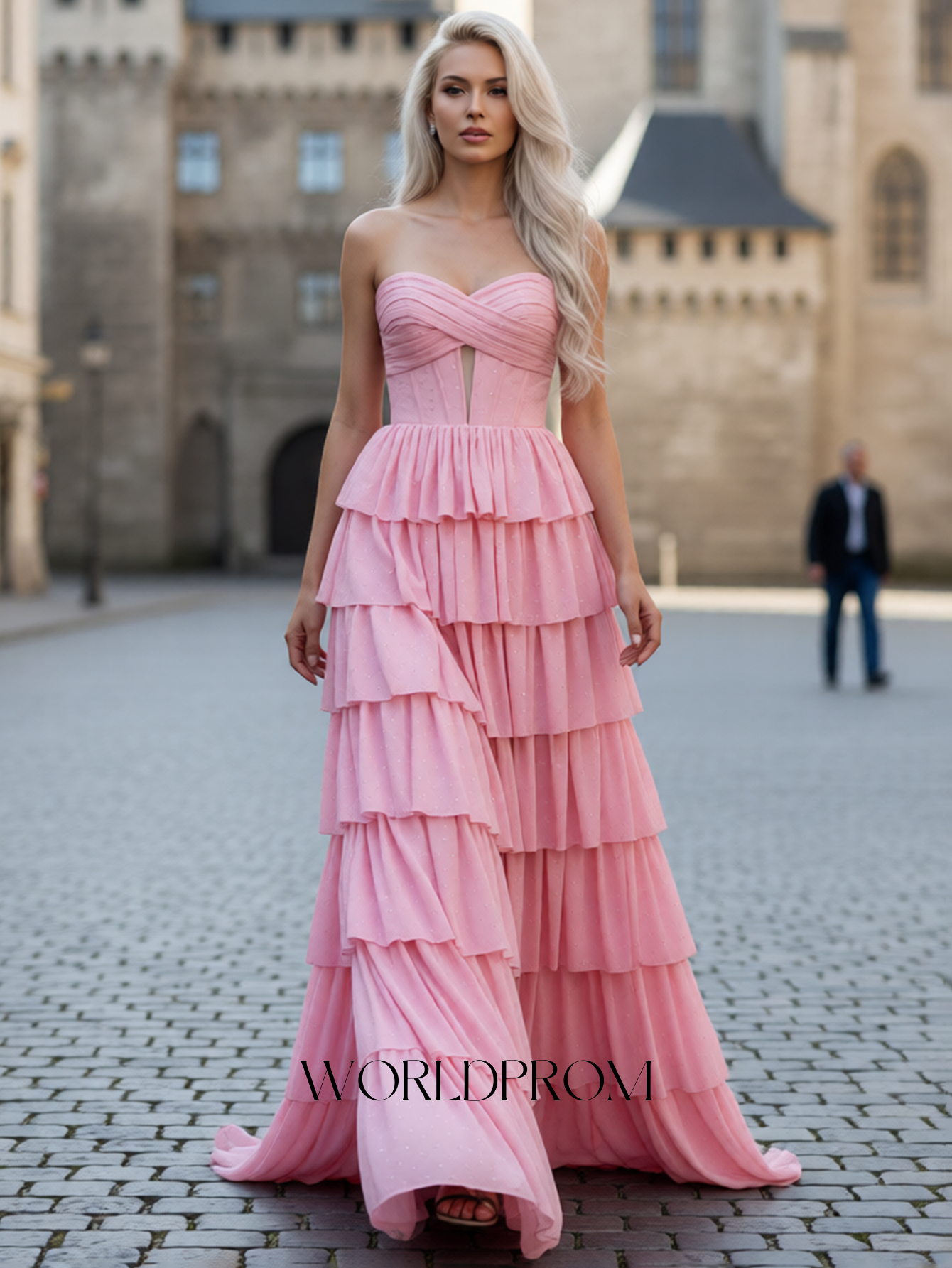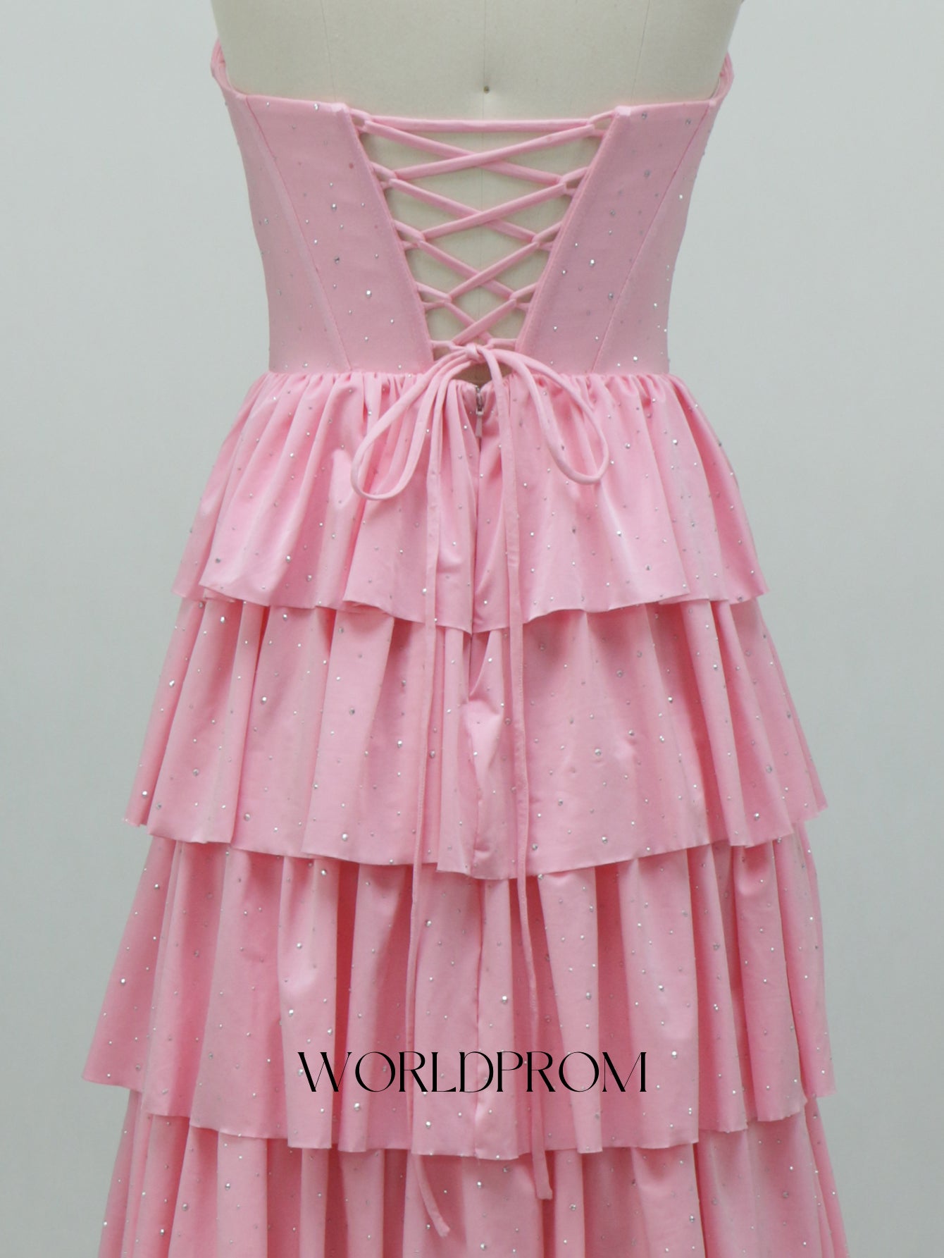 Ruched Bust Cut Front Hot Fix Crystal Layered Ruffle Hem Long Prom Dress - Pink