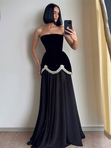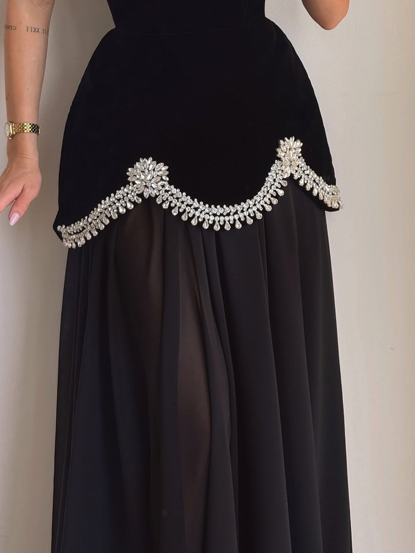 This two-piece long ball gown features crystal on the bodice. The sparkly prom dress has a pleated and chiffon hem. Luxury worldprom maxi dresses are ideal for party, evening or festivals.