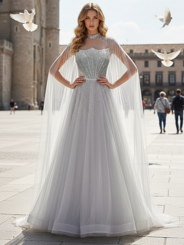 Hot Fix Crystal Bodice Pleated A-Line Long Prom Dress With Shawl - Light Grey