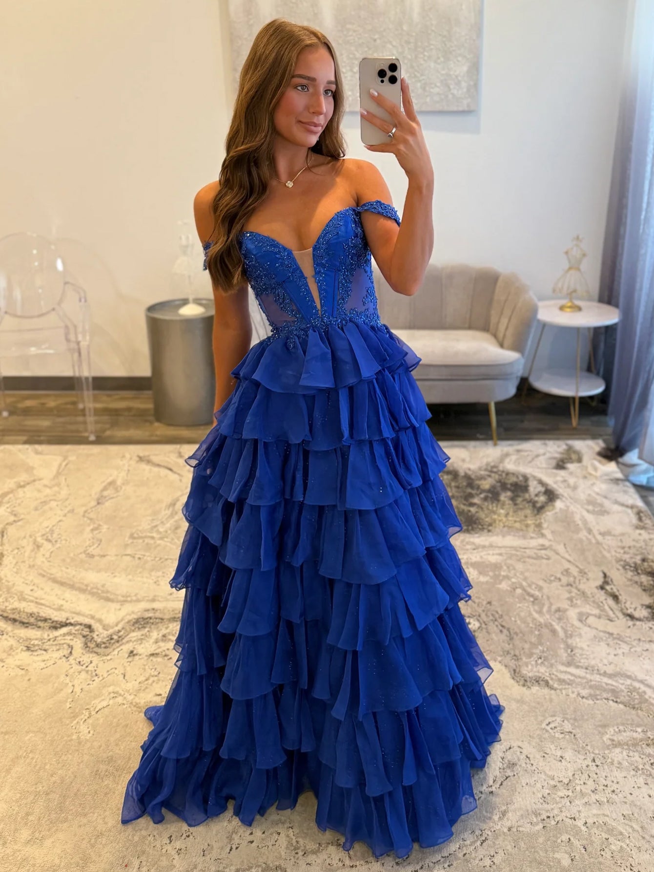 Lace Embroidery Layered Ball Gown Prom Dress - Royal Blue