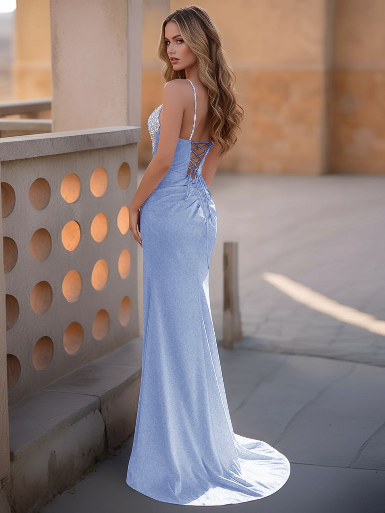Luxury Crystal Lace Up Sheer Bodice Mermaid Prom Dress With Spaghetti Straps - Dusty Blue