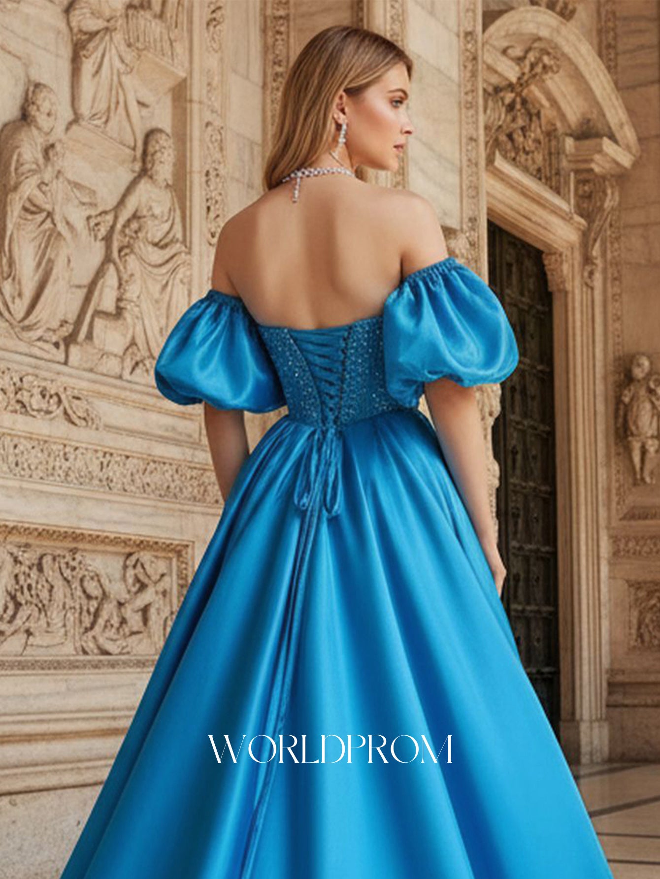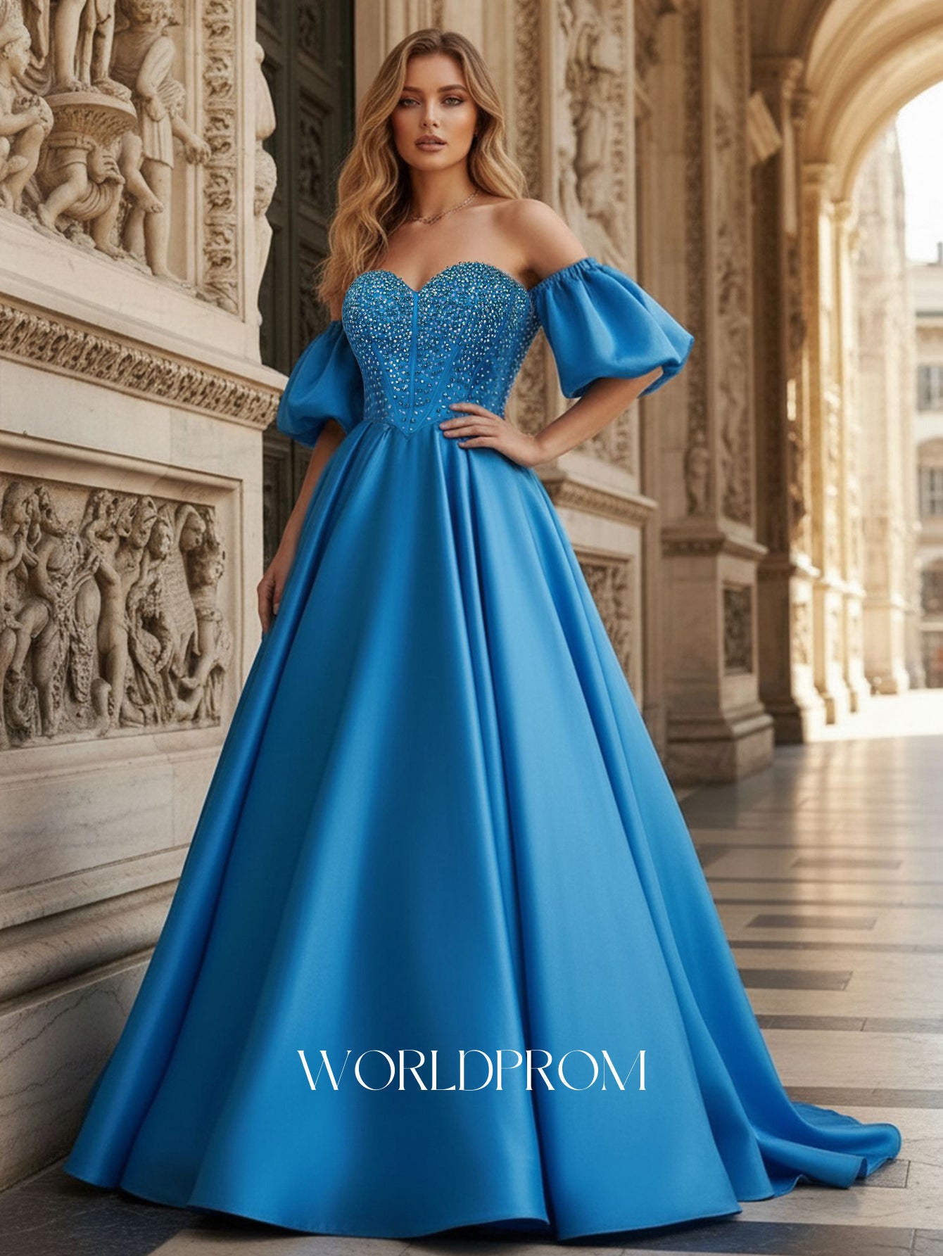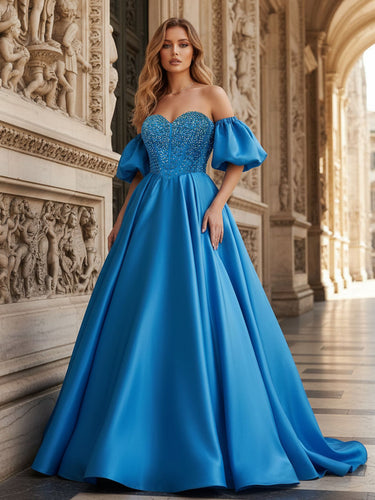 Off Shoulder Puff Sleeve Hot Fix Ball Gown Prom Dress - Blue