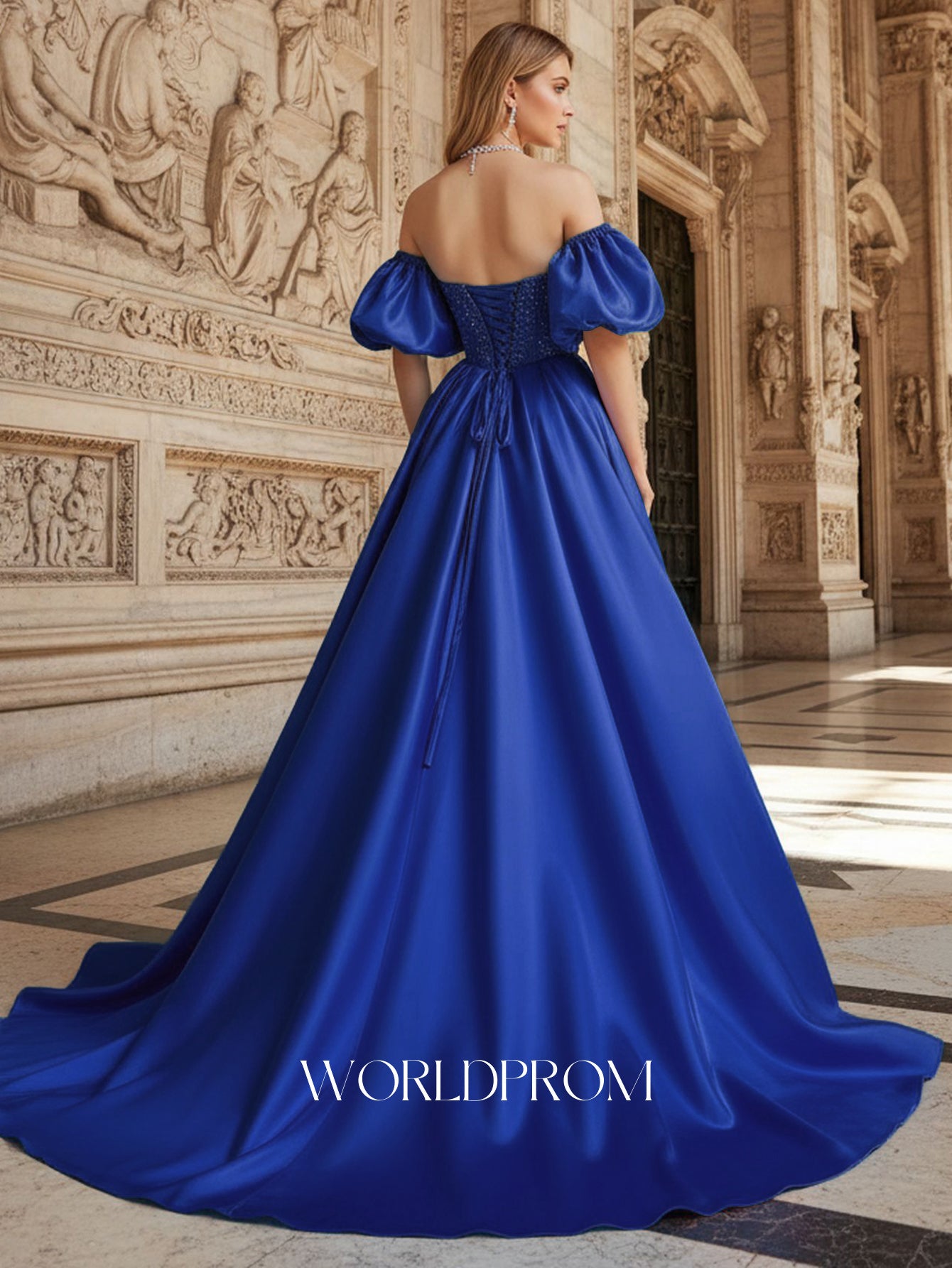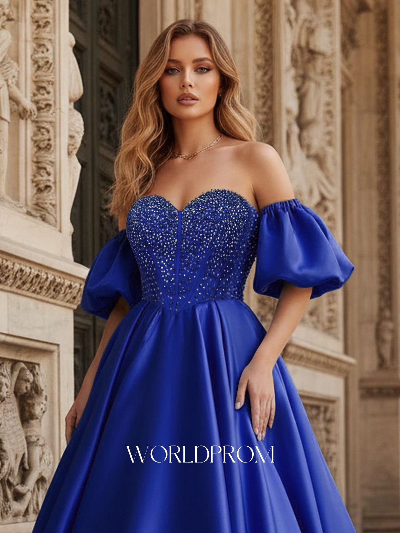 Off Shoulder Puff Sleeve Hot Fix Ball Gown Prom Dress - Royal Blue