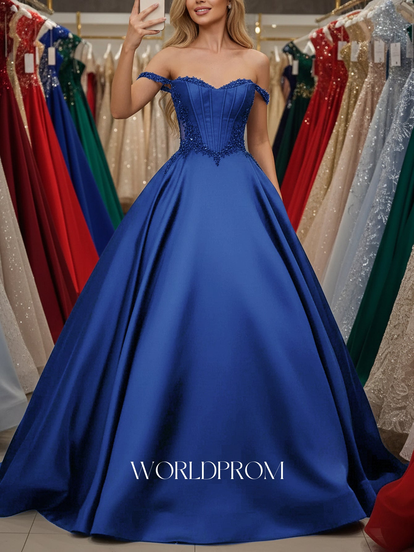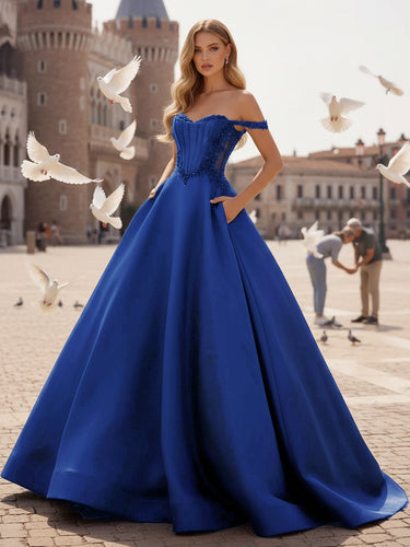 This satin prom gown features sparkly beading with pockets on the illusion bodice. The off shoulder dress has a sweetheart neckline and pleated hem. Worldprom ball gown prom dresses are ideal for party, evening or festivals.