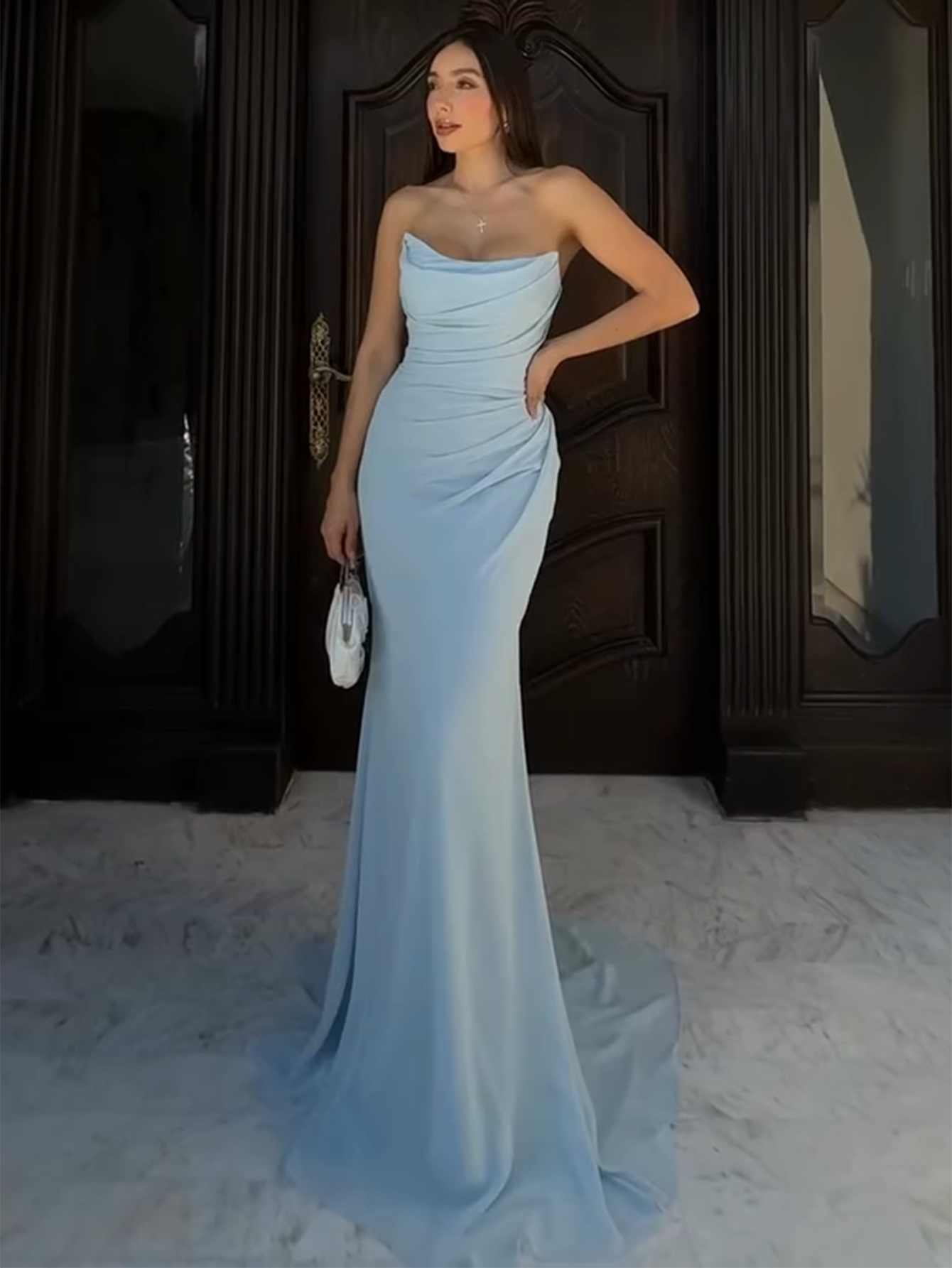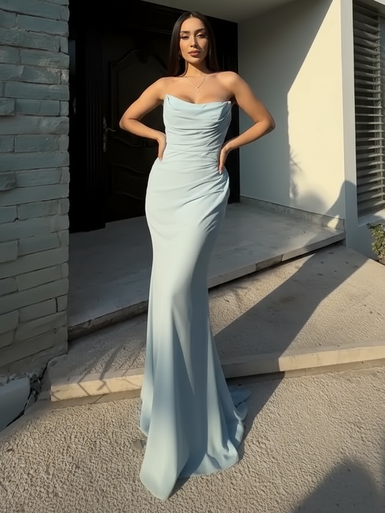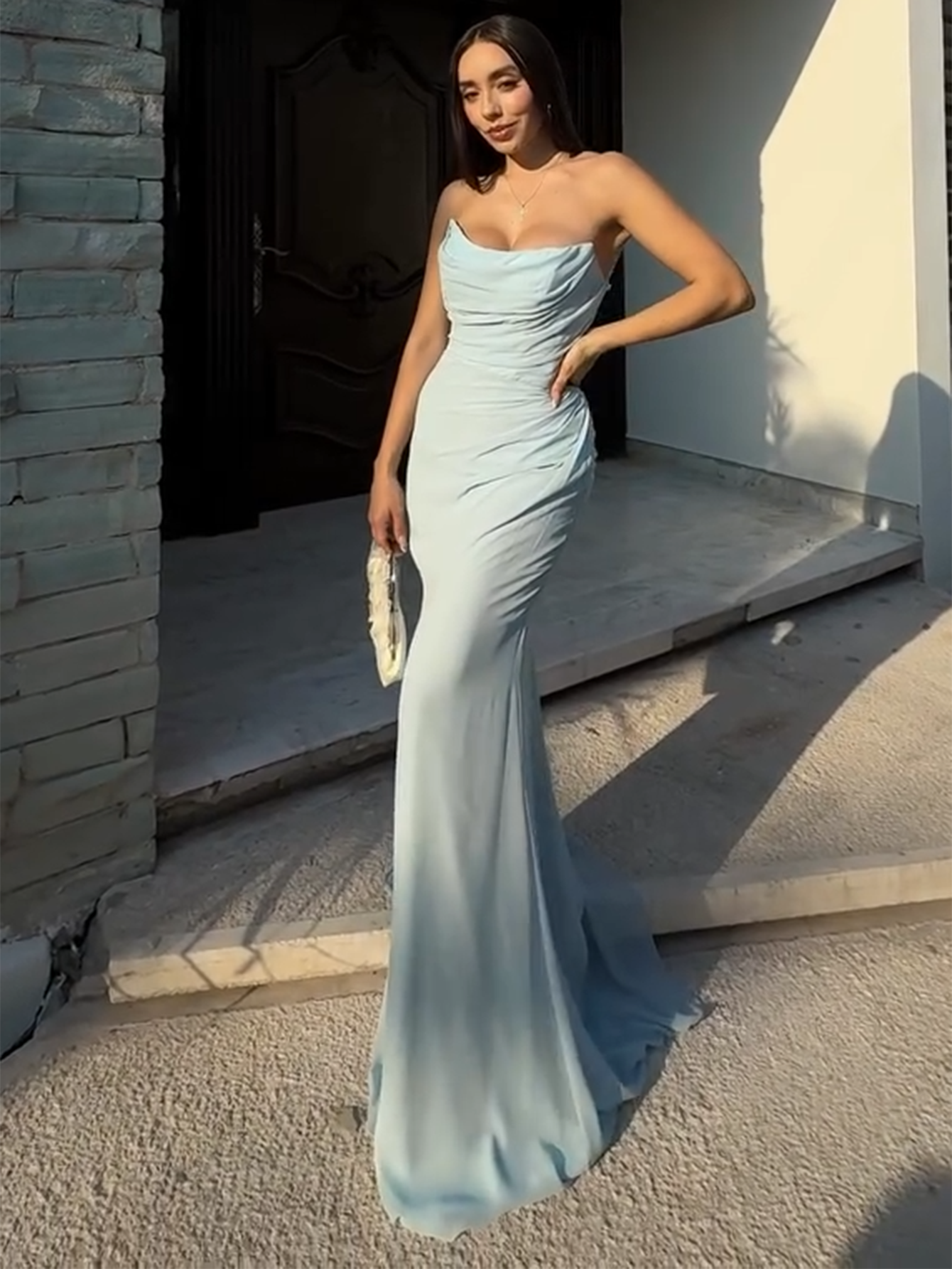 Strapless Ruched Bust Mermaid Long Prom Dress - Sky Blue