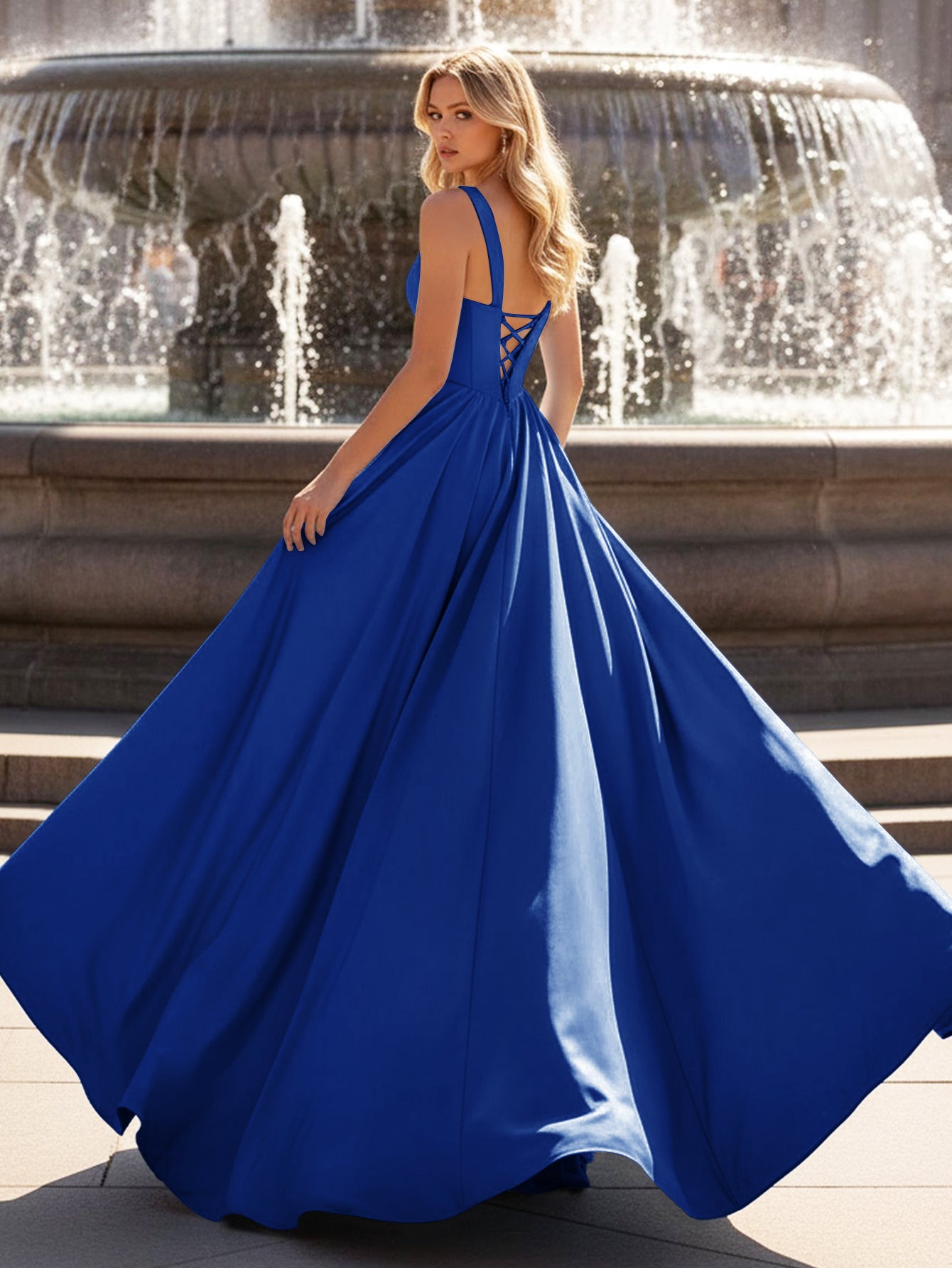 This satin prom gown features boned with crystals on the bodice. The tank top evening dress has a V-neck and pleated hem. This classy ball gown dress is ideal for party, evening or festivals.