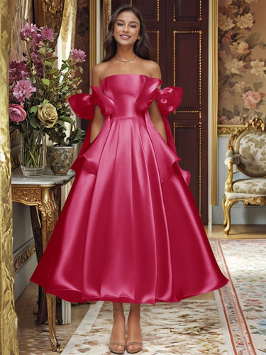 Bow Bodice Satin Ankel Ball Gown Prom Dress - Hot Pink