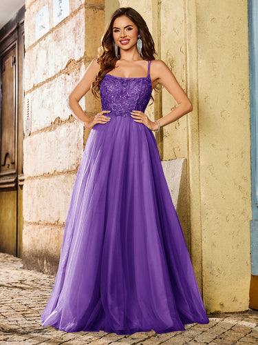 This tulle prom dress features hand beading on the bodice. The spaghetti straps dress has a square neck and pleated hem. This maxi party dress is ideal for party, evening or festivals.