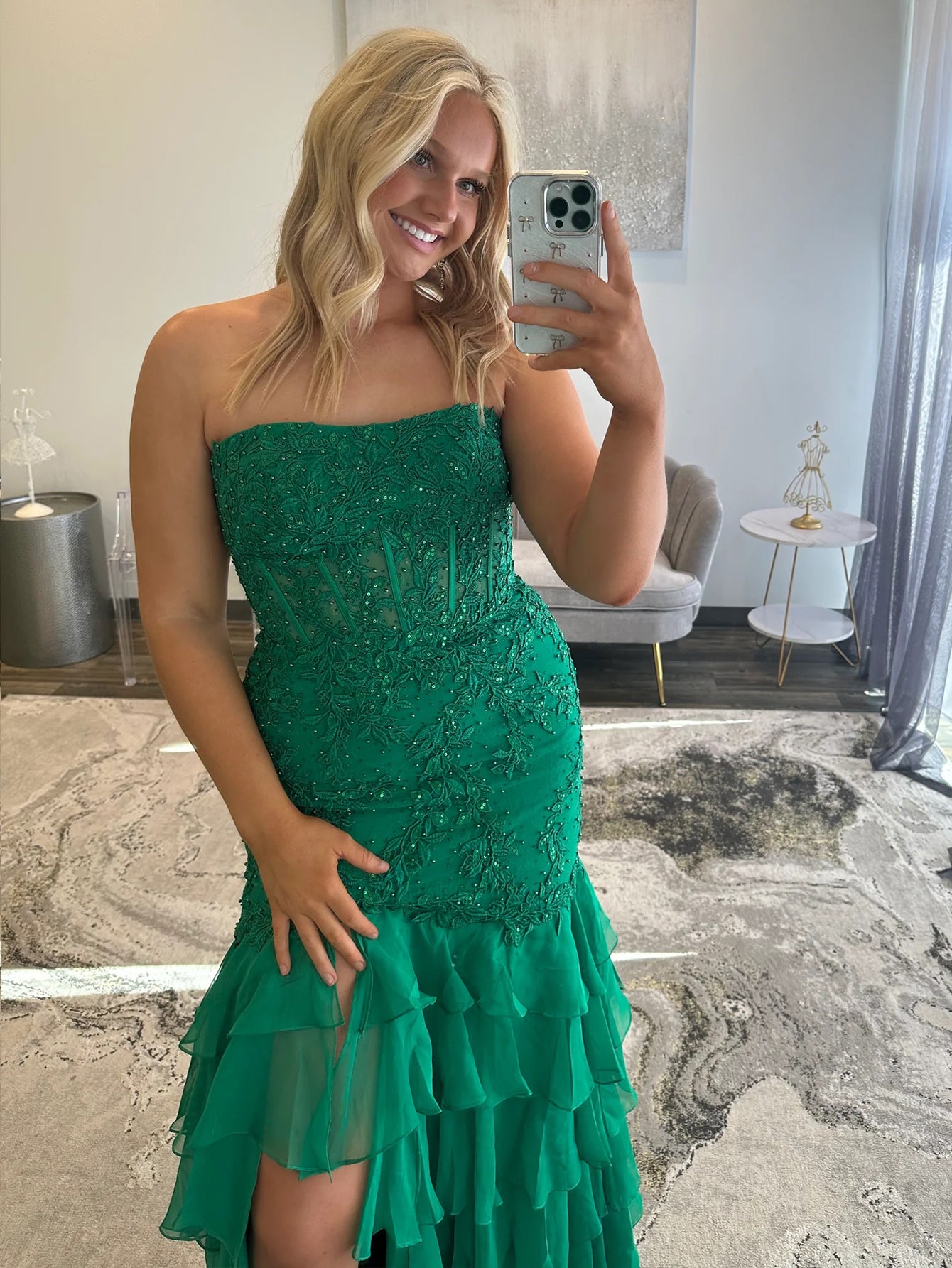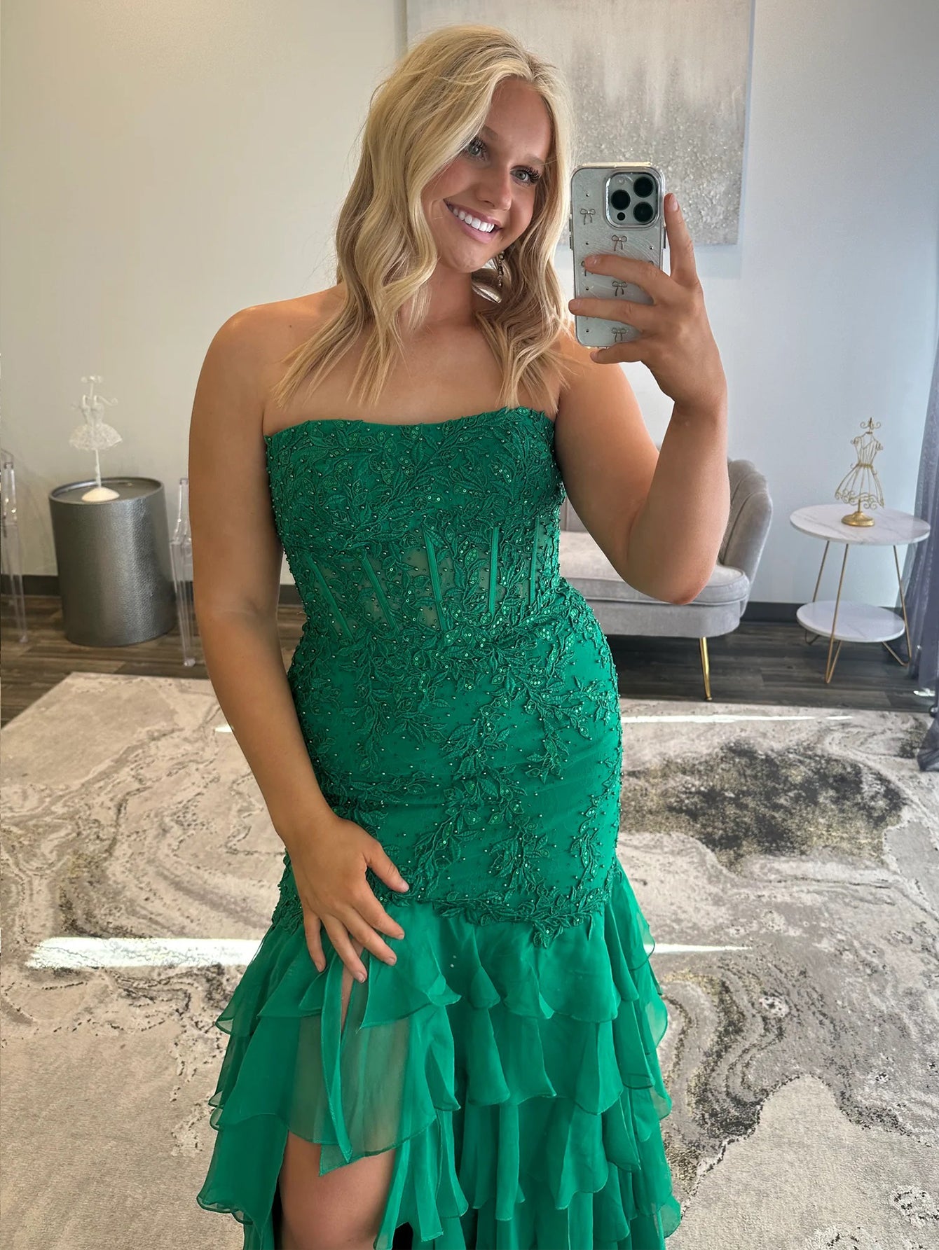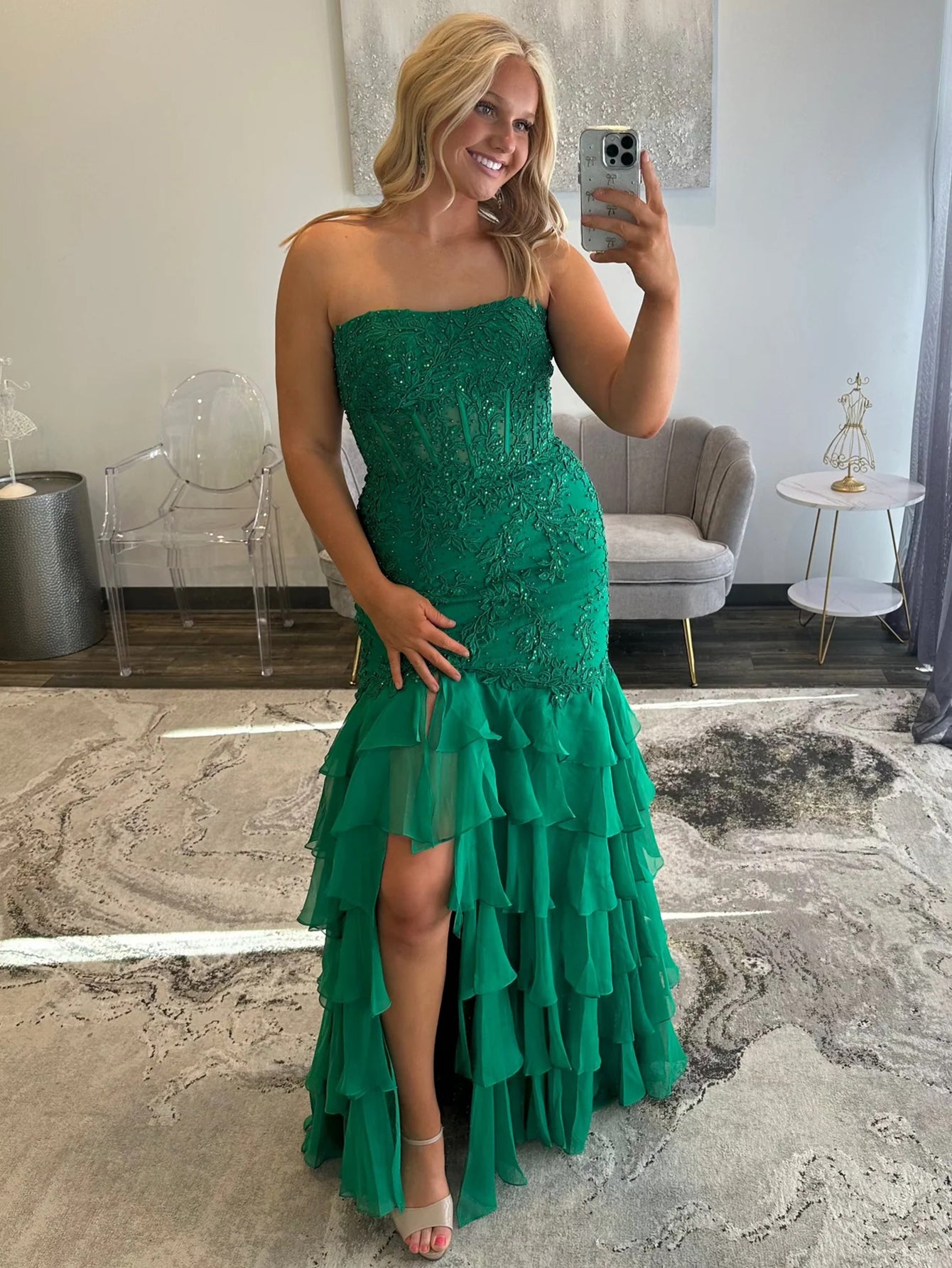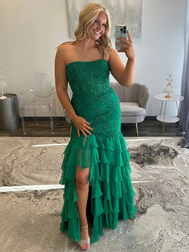 Leaf Lace Illusion Ruffle Mermaid Prom Dress - Green
