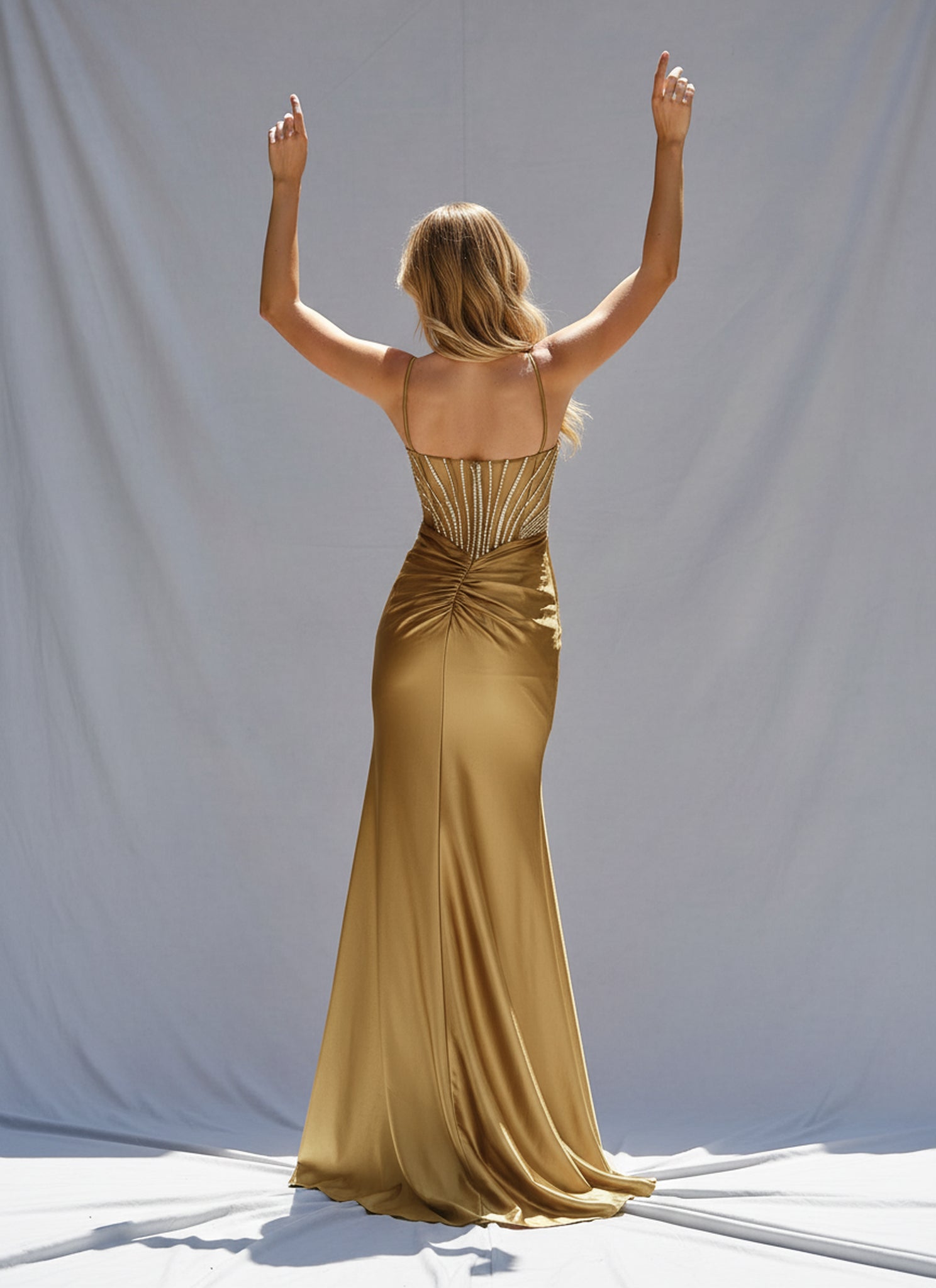 Details: Backless, Crystals, Split, Ruched, Dubai