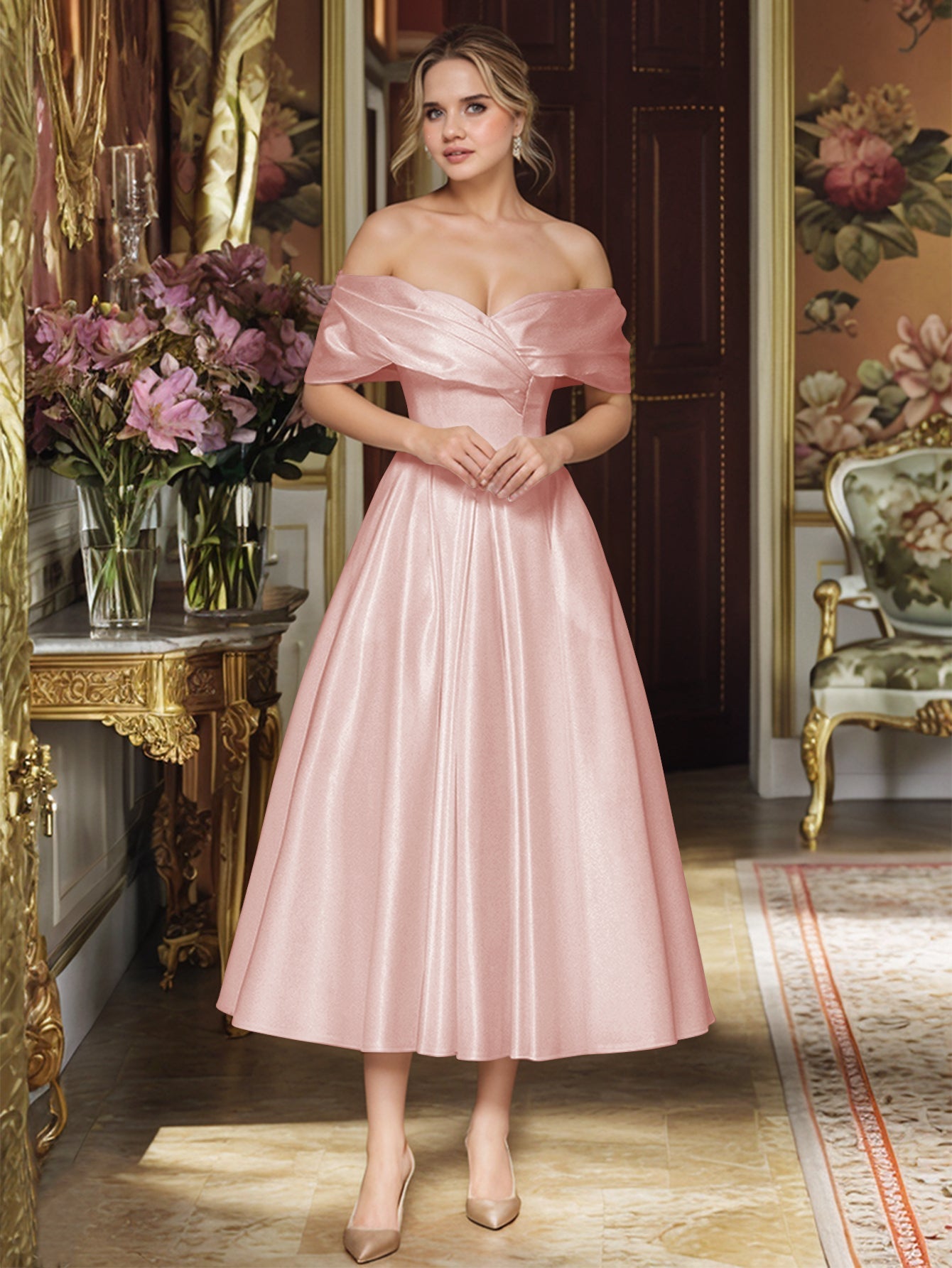Off Shoulder Satin Ankle Ball Gown Prom Dress - Blush Pink
