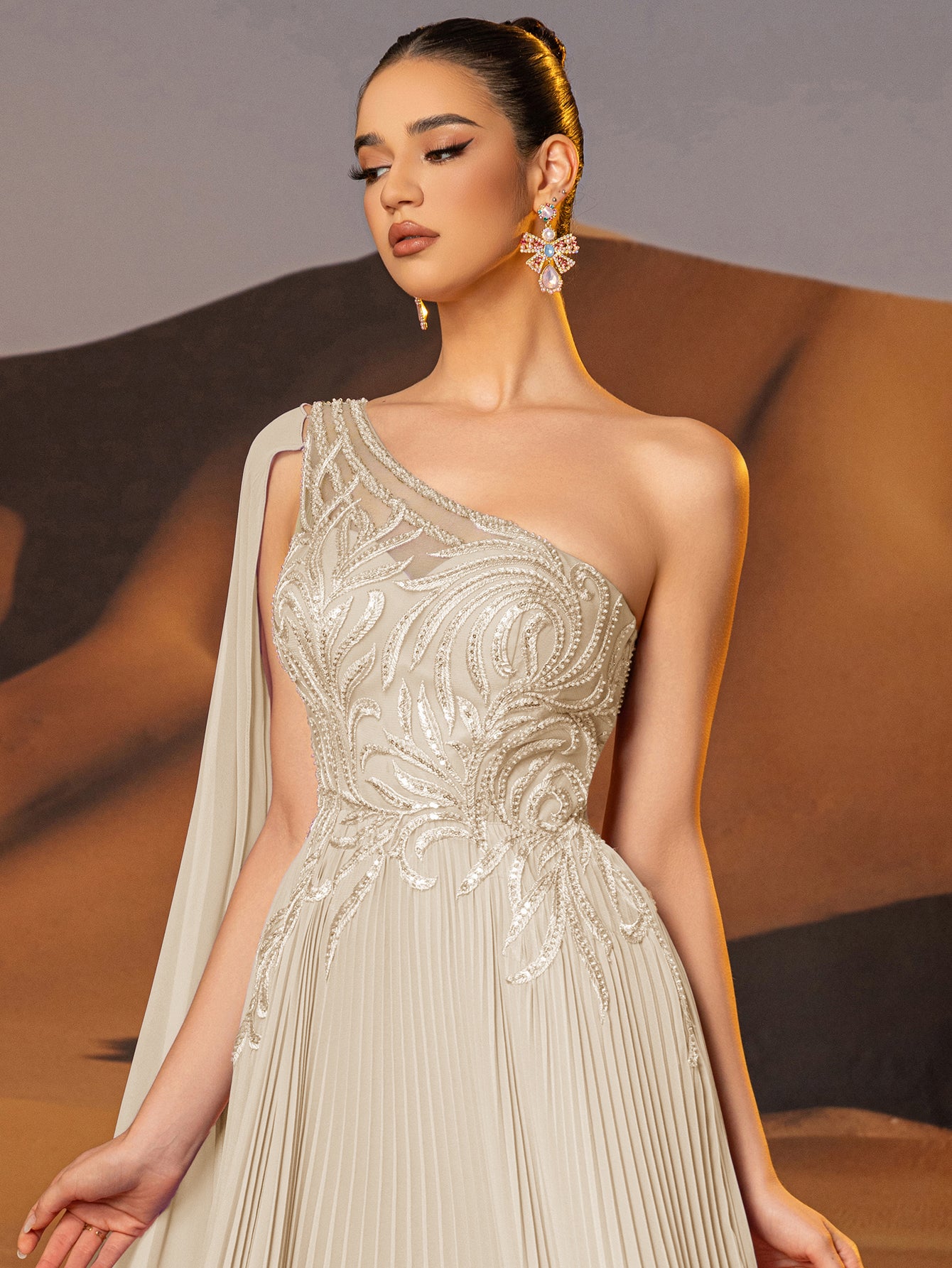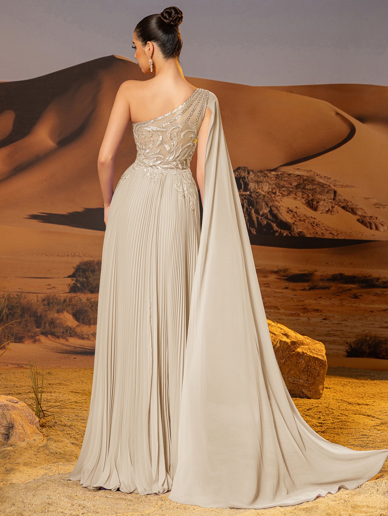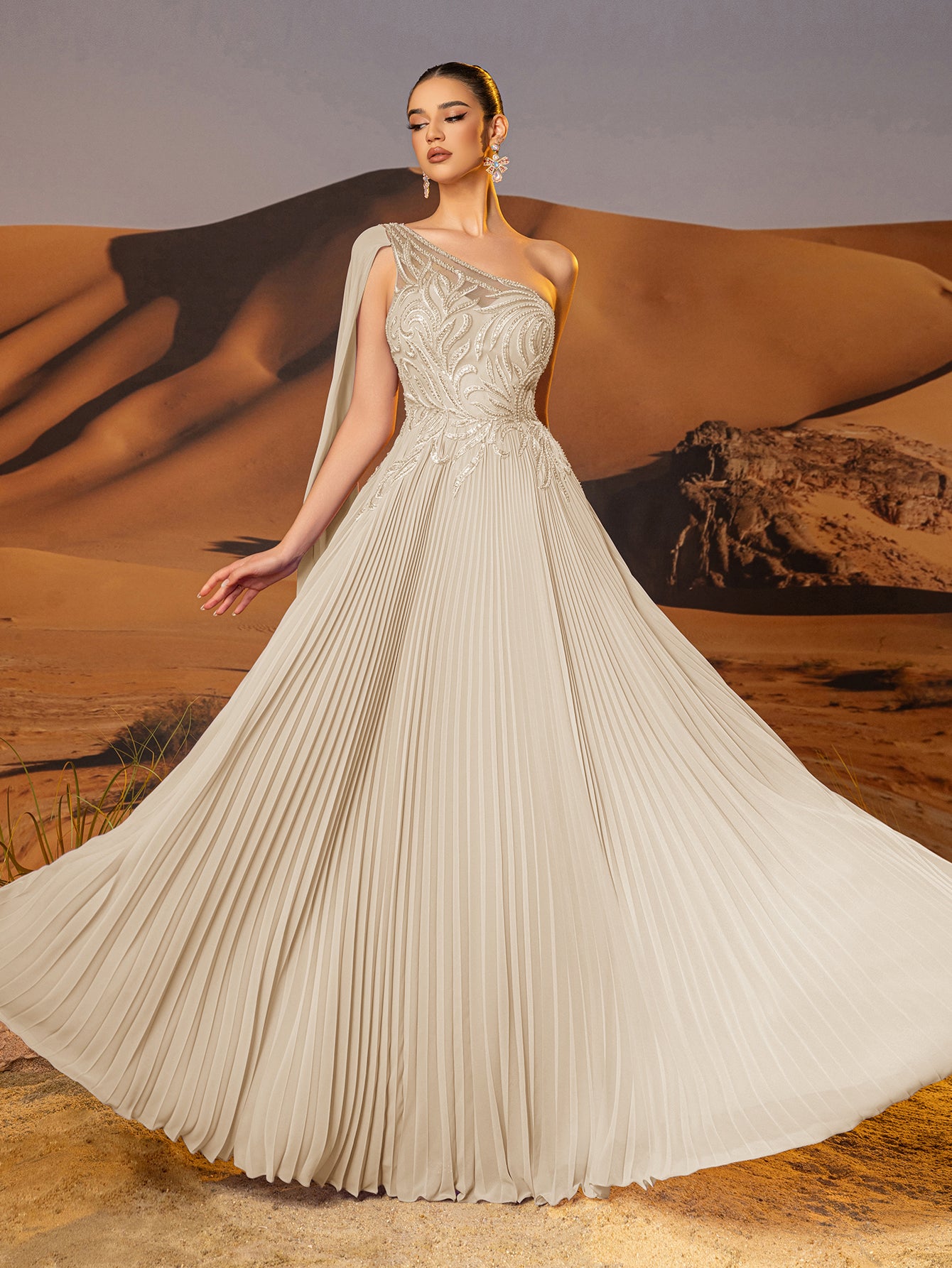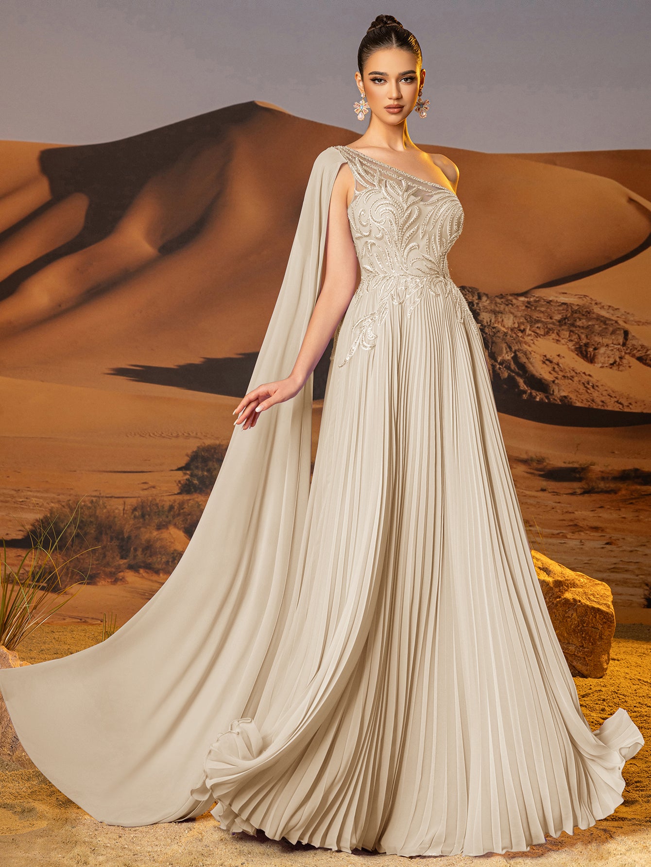 This chiffon gown features beaded embroidery and drop train on the bodice. The one shoulder dress for prom has a asymmetrical Neckline and pleated hem. This a-line dress for cocktail is ideal for party, evening or festivals.
