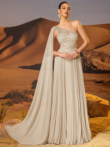 One Shoulder Beaded Pleats Long A-Line Prom Dress With Tulle - Champagne