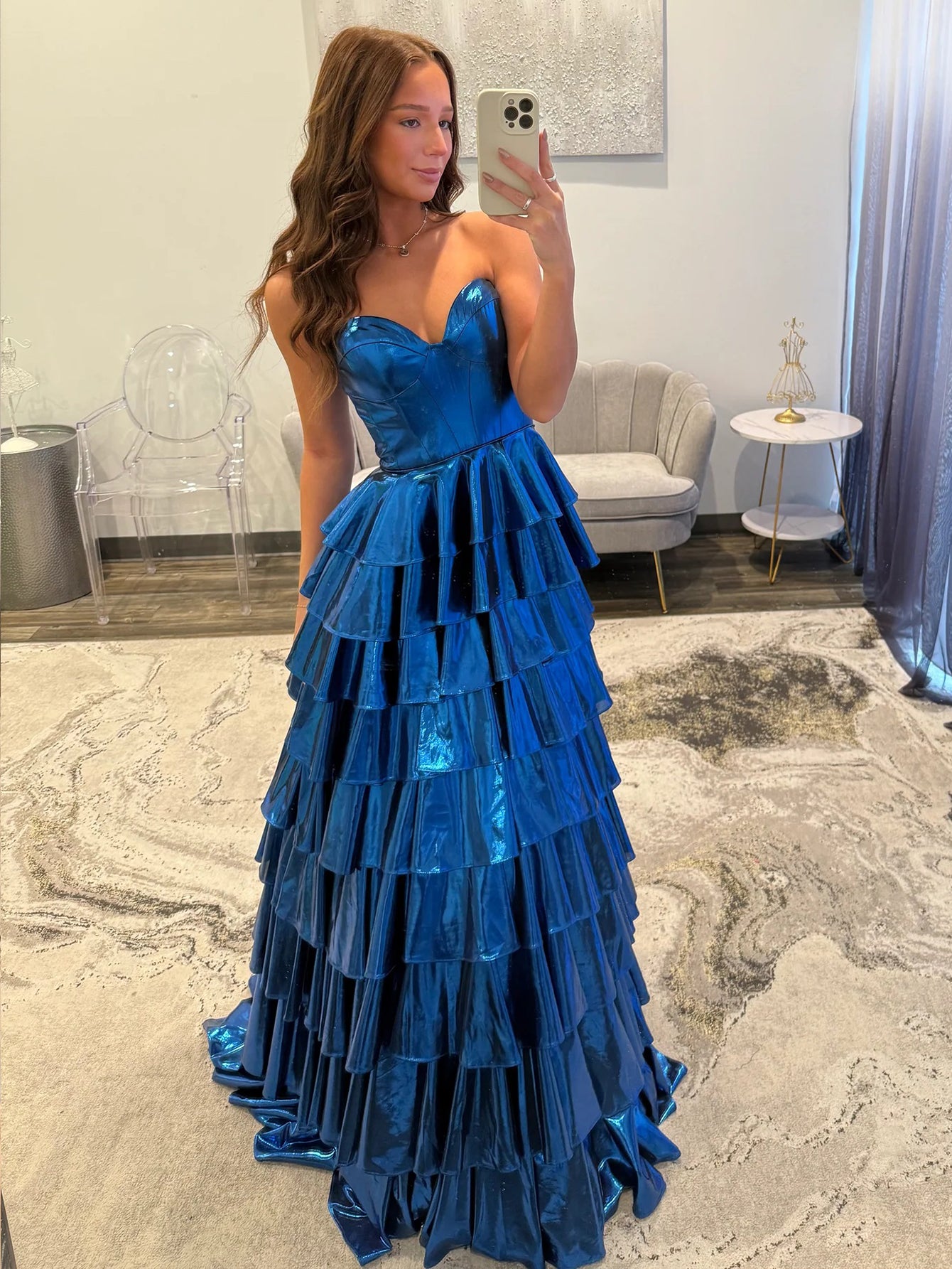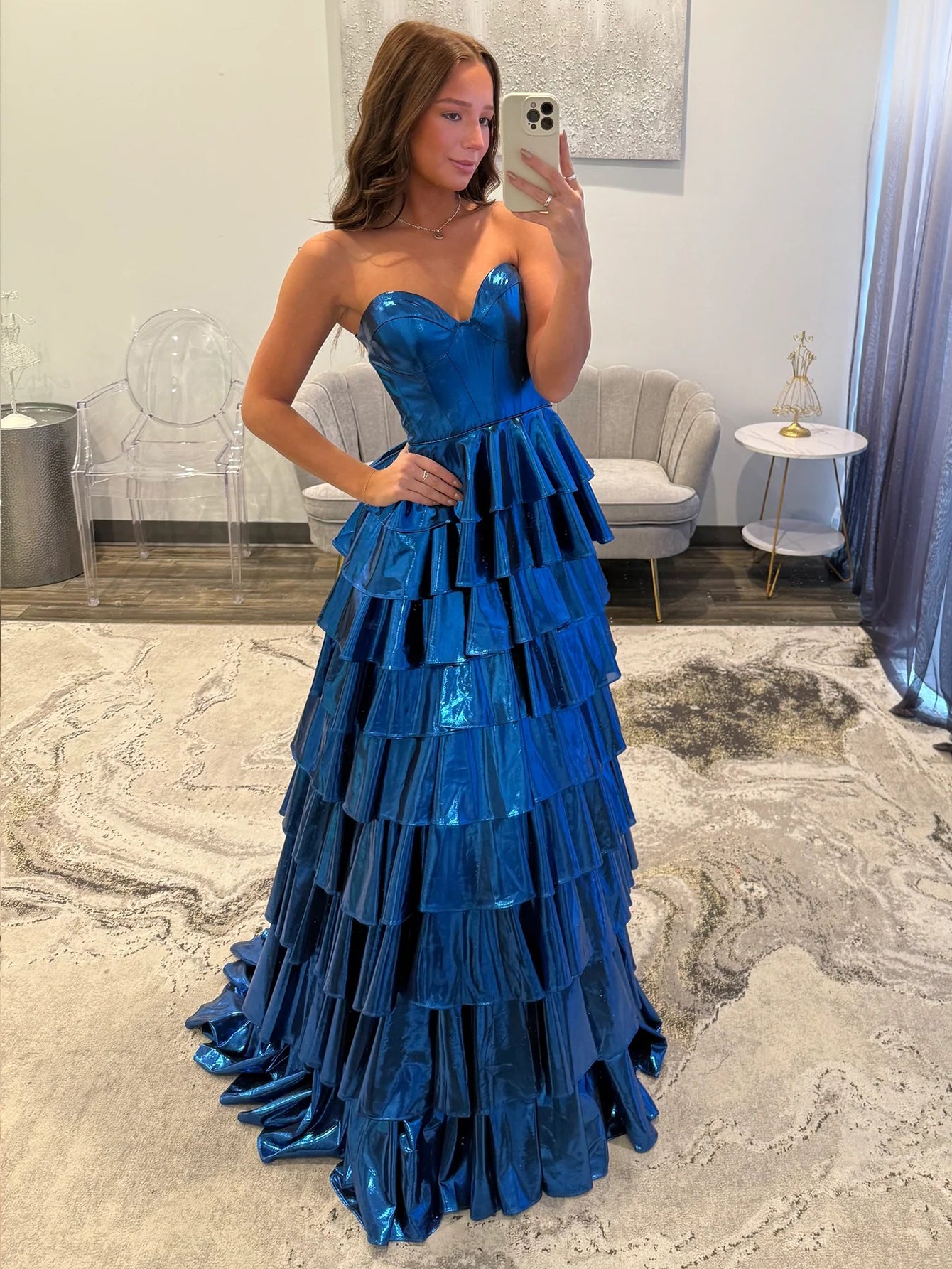 Ruffle Strapless Sparkly Ball Gown Prom Dress - Blue