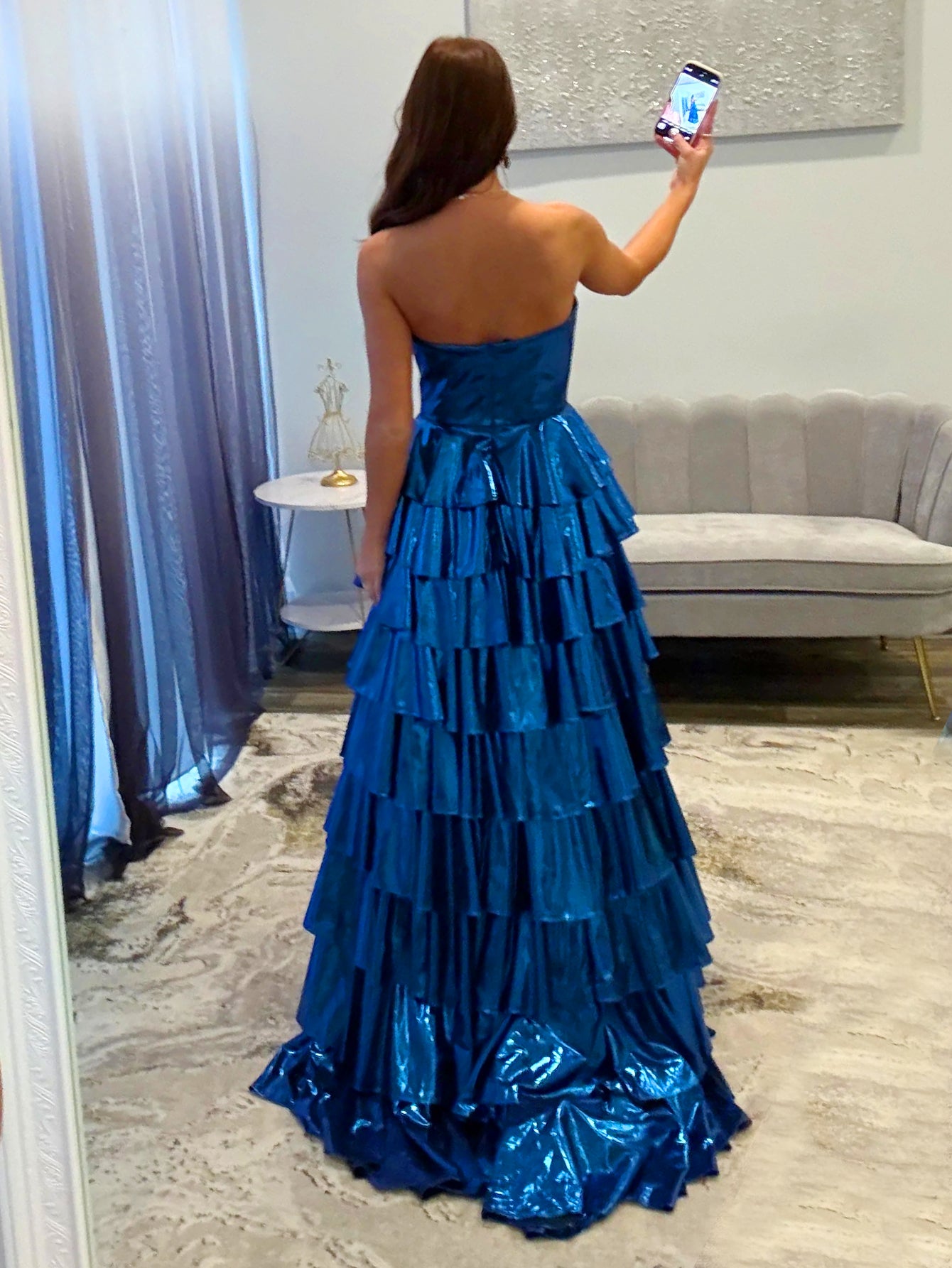 Details: Backless, Fitted Waist, Sparkly, Ruffle
