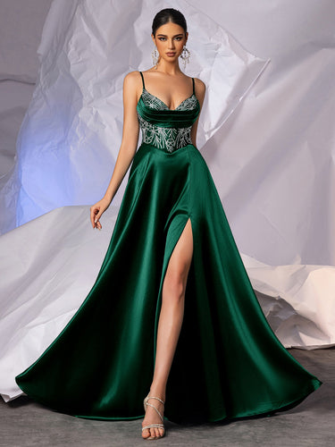 This satin prom gown features ruched bust with sheer on the bodice. The spaghetti strap maxi dress has a v neckline and split hem. This a-line formal long ball gown is ideal for party, evening or festivals.