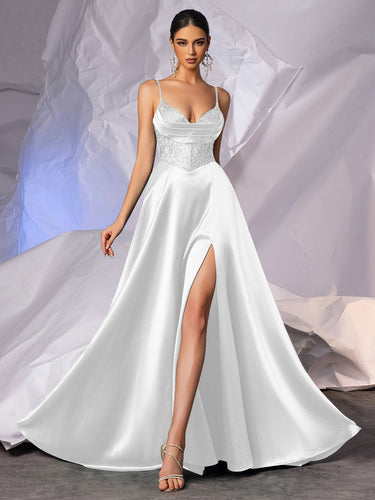 This satin prom gown features ruched bust with sheer on the bodice. The spaghetti strap maxi dress has a v neckline and split hem. This a-line formal long ball gown is ideal for party, evening or festivals.