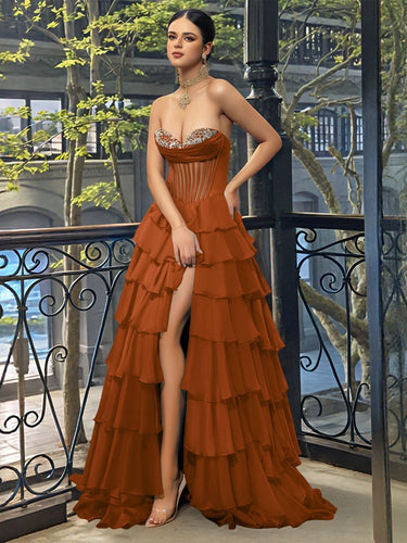 Strapless Corset Ball Gown With Ruffle Skirt Slit - Burnt Orange
