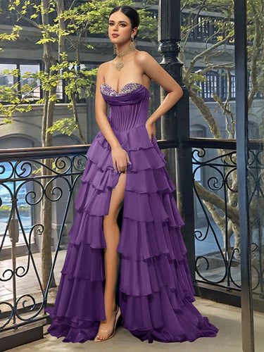 Strapless Corset Ball Gown With Ruffle Skirt Slit - Purple