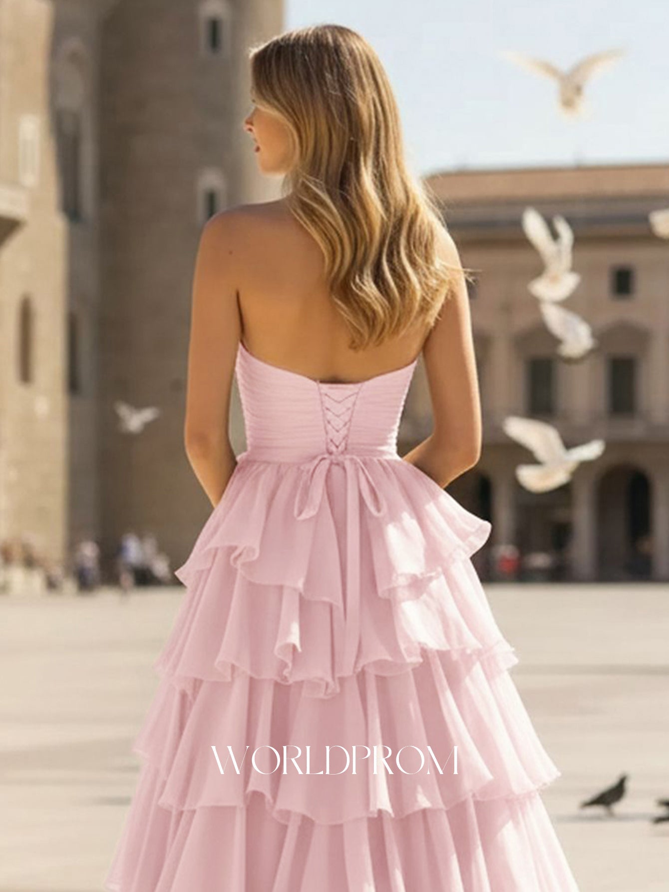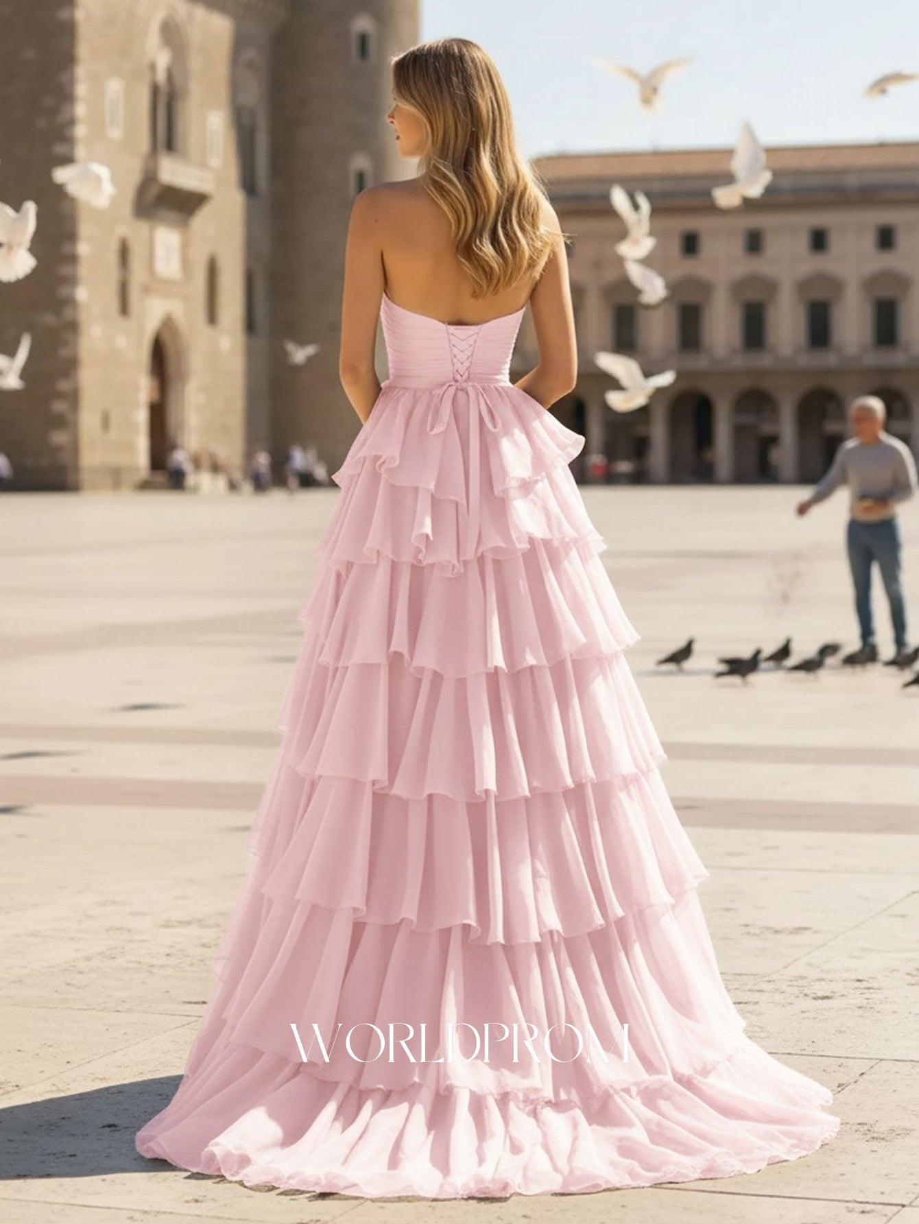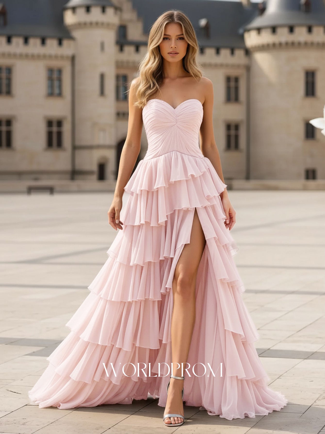 This tulle prom gown features ruched bust on the bodice. The strapless ruffled dress has a sweetheart neckline and split hem. Worldprom ball gown prom dresses are ideal for party, evening or festivals.