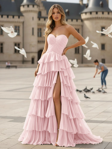 Sweetheart Ruched Bust Ruffle Hem Lace Up Long Ball Gown Prom Dress With Slit - Pink
