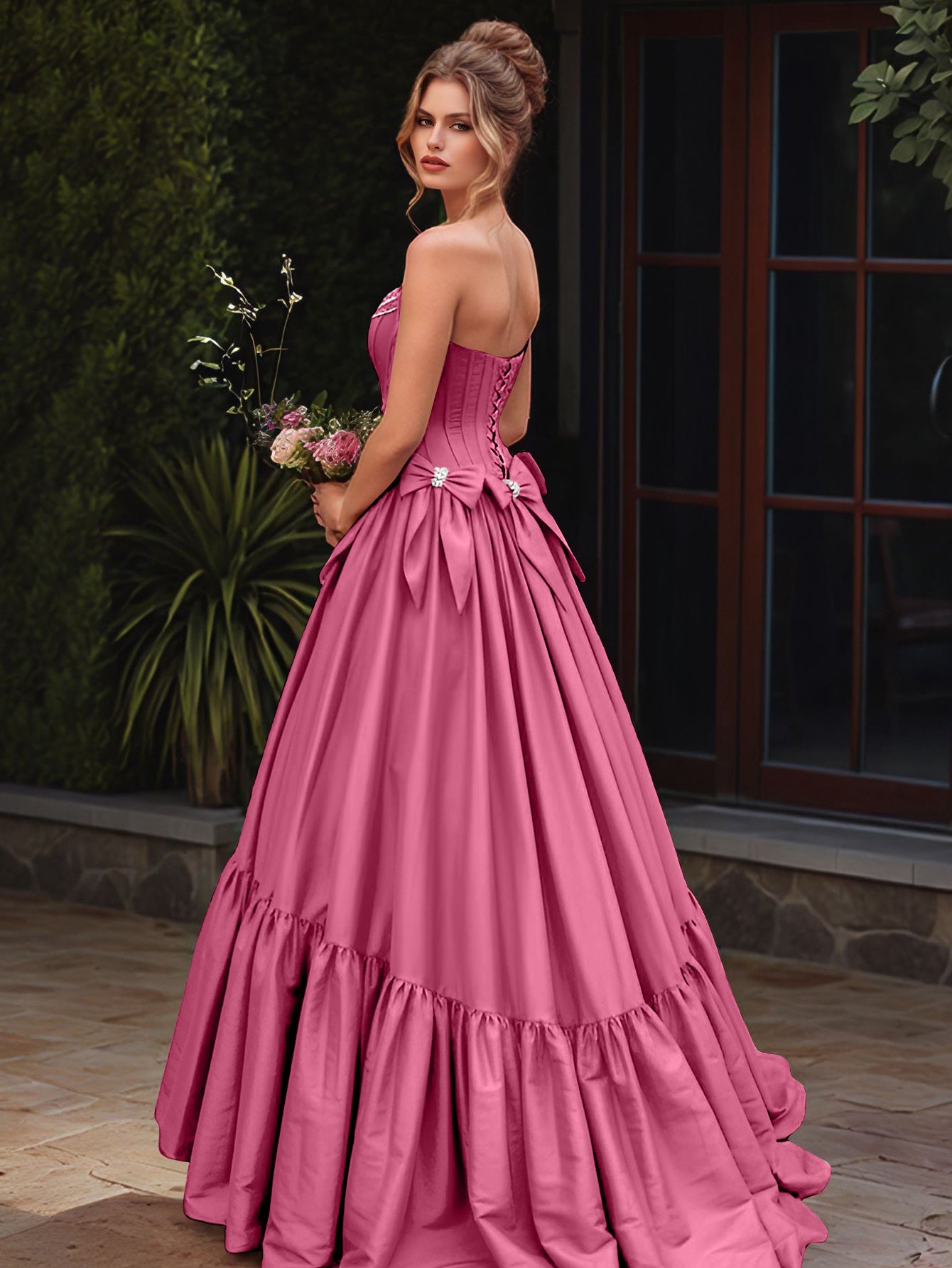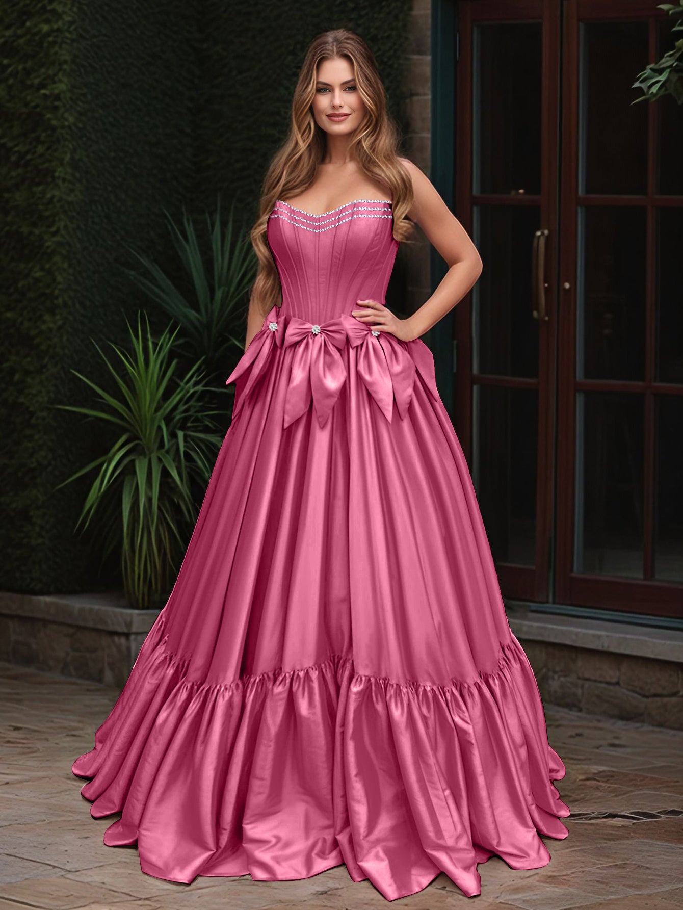 Boned Top Strapless Beaded Ball Gown Prom Dress With Bow - Hot Pink