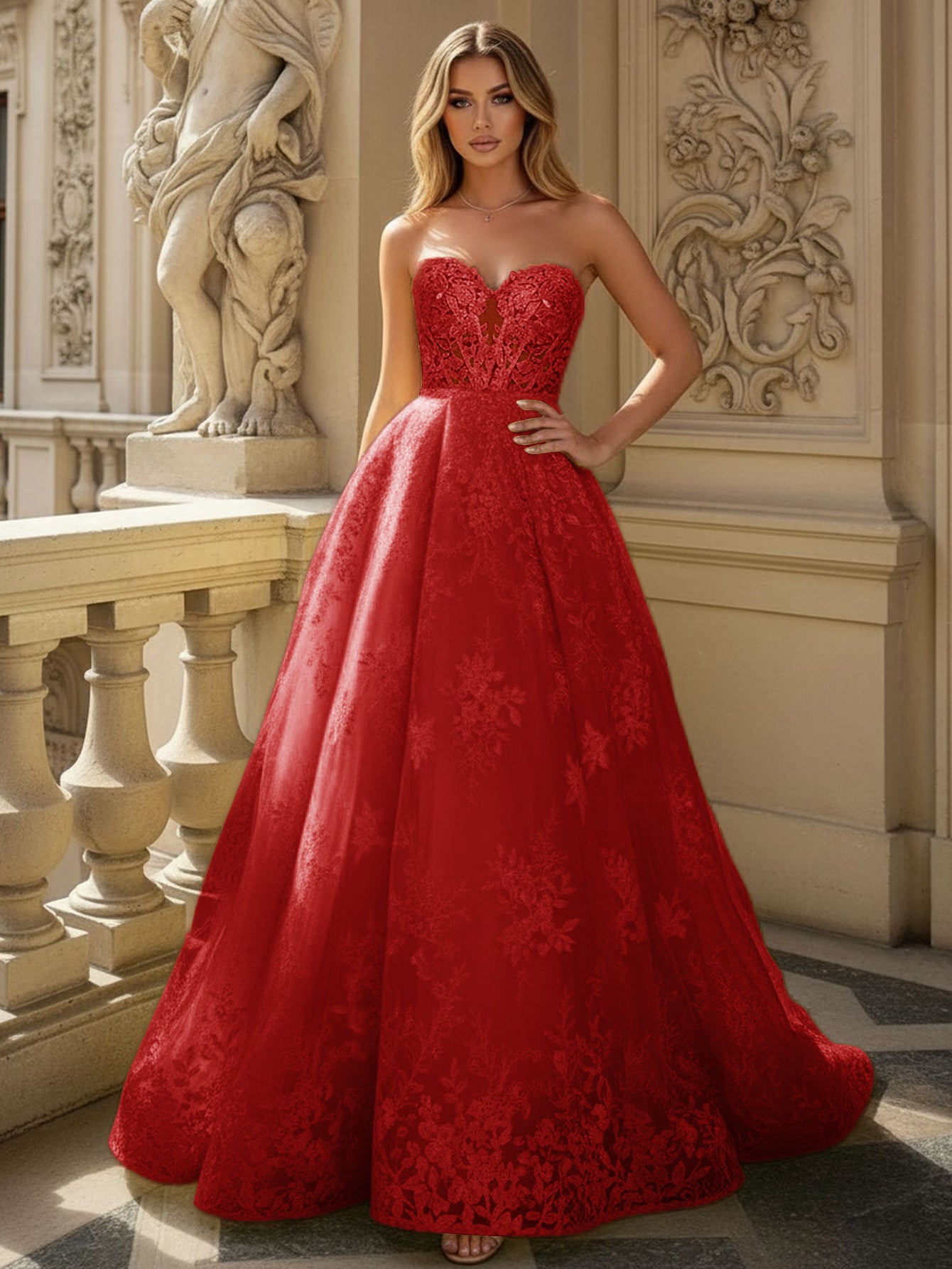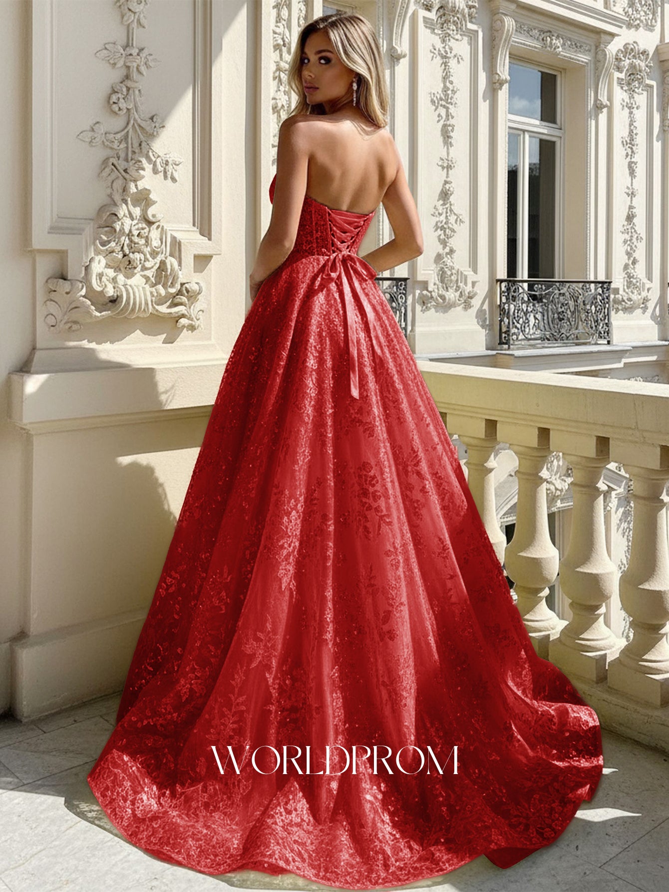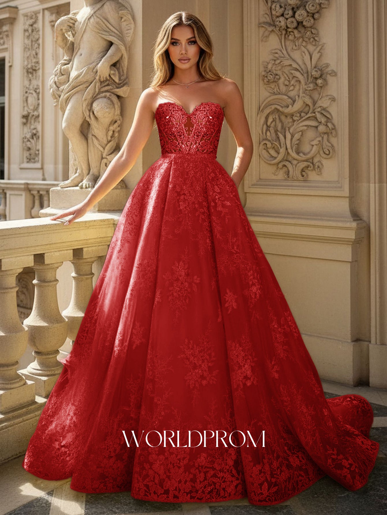 This prom gown features lace embroidery and cut out with pockets on the illusion bodice. The strapless dress has a sweetheart neckline and pleated hem. Worldprom ball gown dresses are ideal for party, evening or festivals.