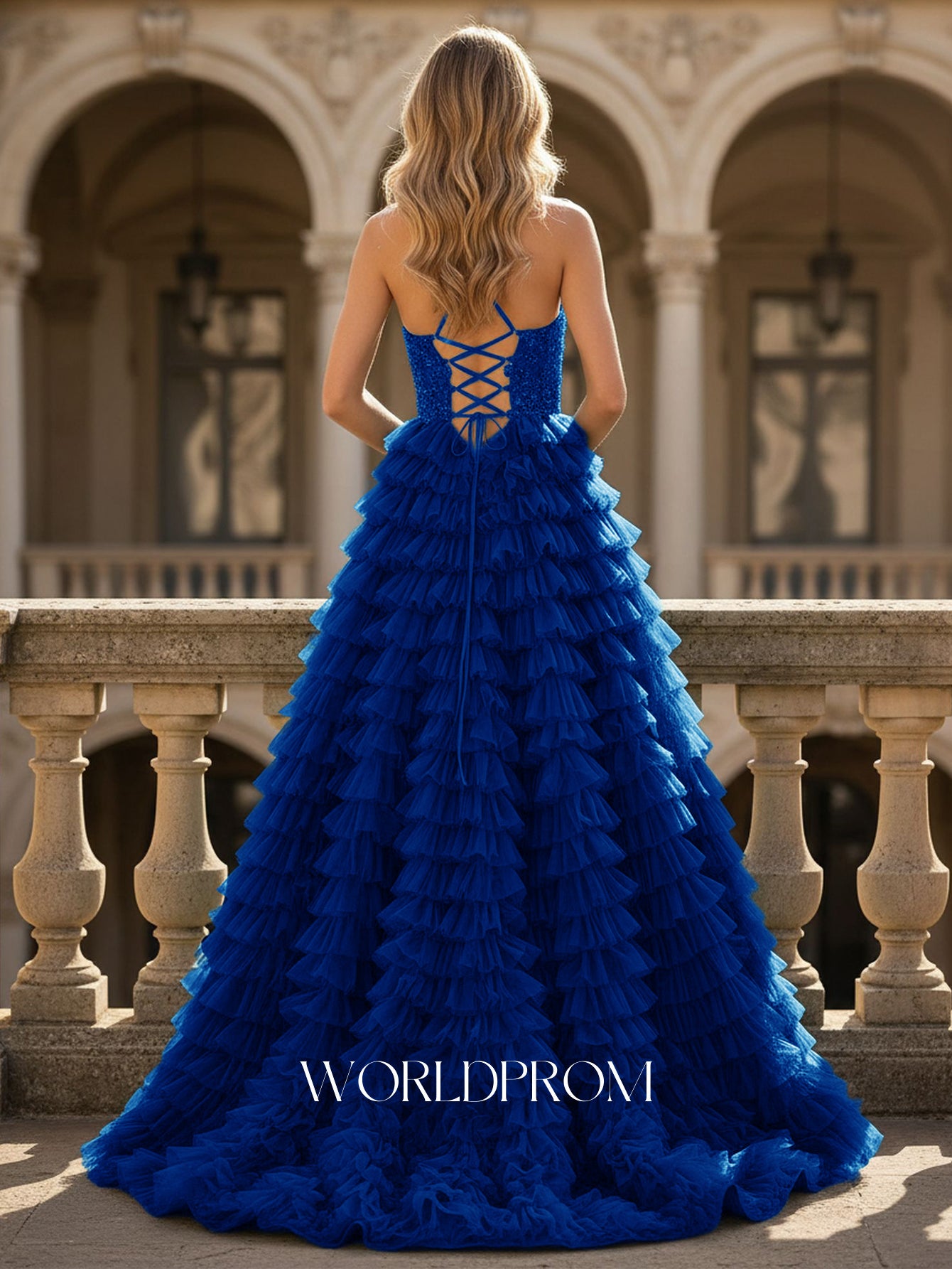 This tulle prom dress features embroidery lace up and criss cross back on the bodice. The spaghetti straps dress for prom has a v-neck and layered ruffle hem. This ball gown prom dress is ideal for party, evening, anniversary party, birthday party, cocktail, graduation party or homecoming events.