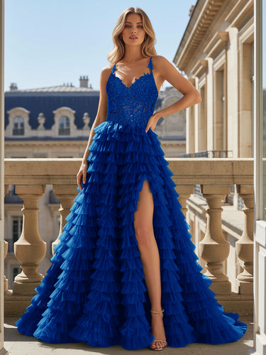 Sparkly Bodice Spaghetti Strap Layered Slit Ball Gown Prom Dress - Royal Blue