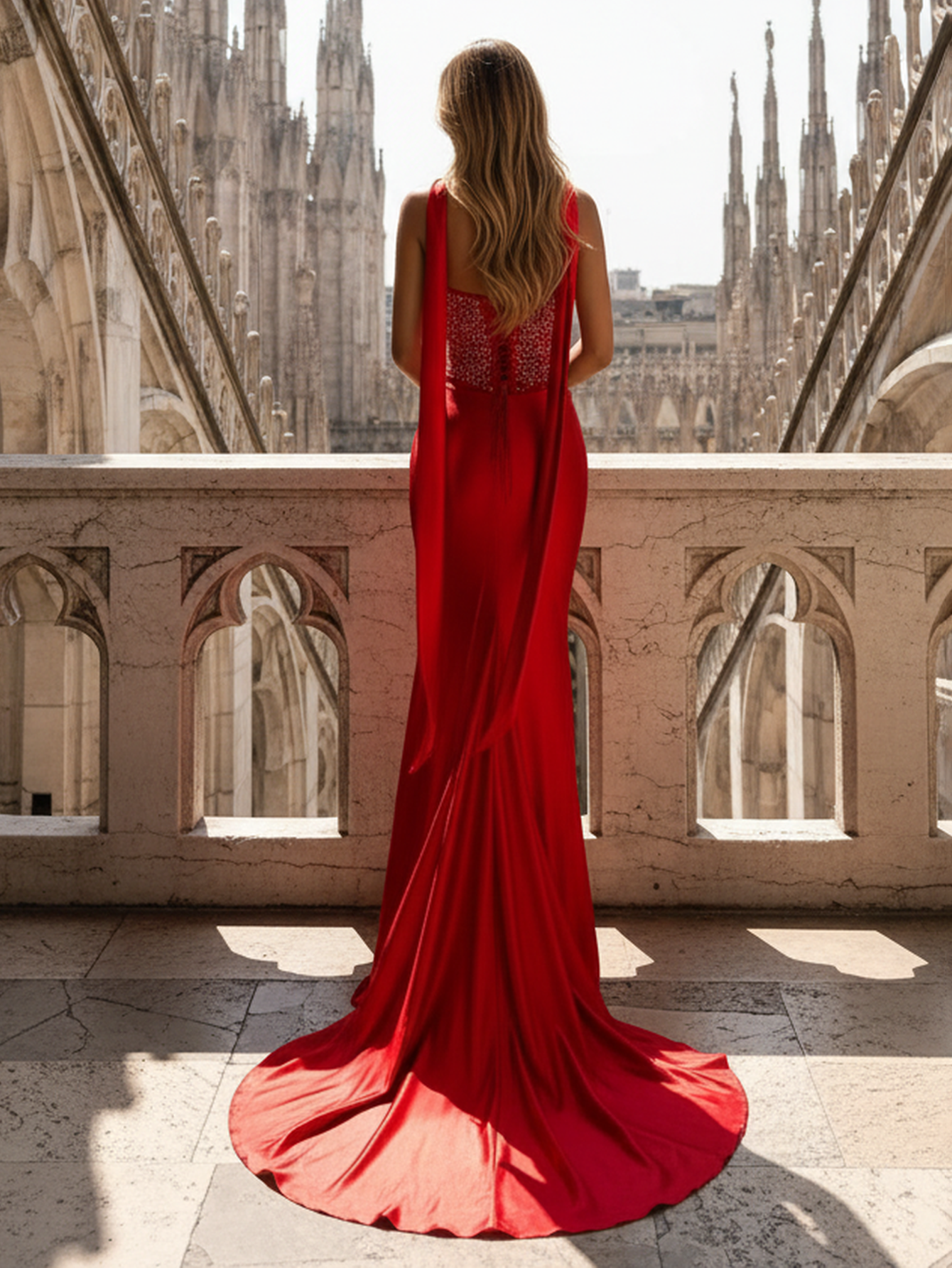 Two Pieces Hot Fix Crystal Corset Long Mermaid Prom Dress With Shawl - Red
