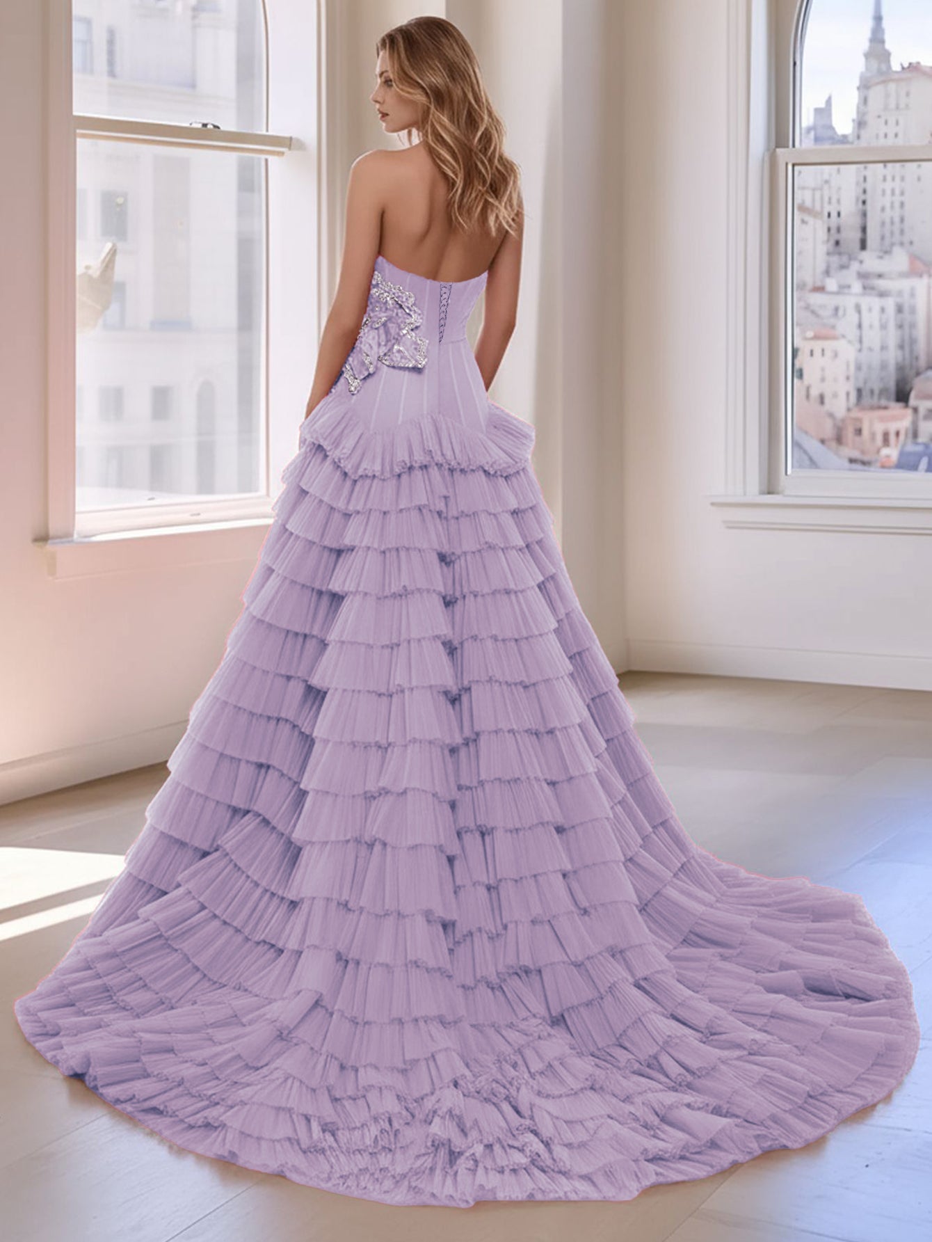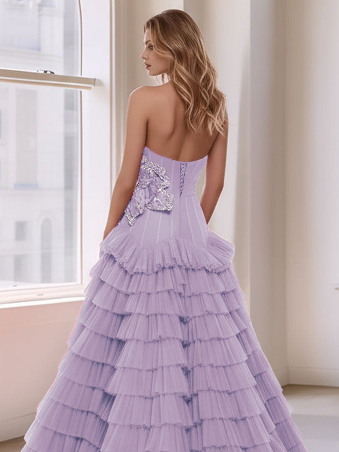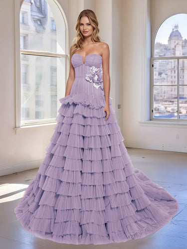 3D Rose Waist Strapless Tiered Ball Gown Evening Dress - Lavender