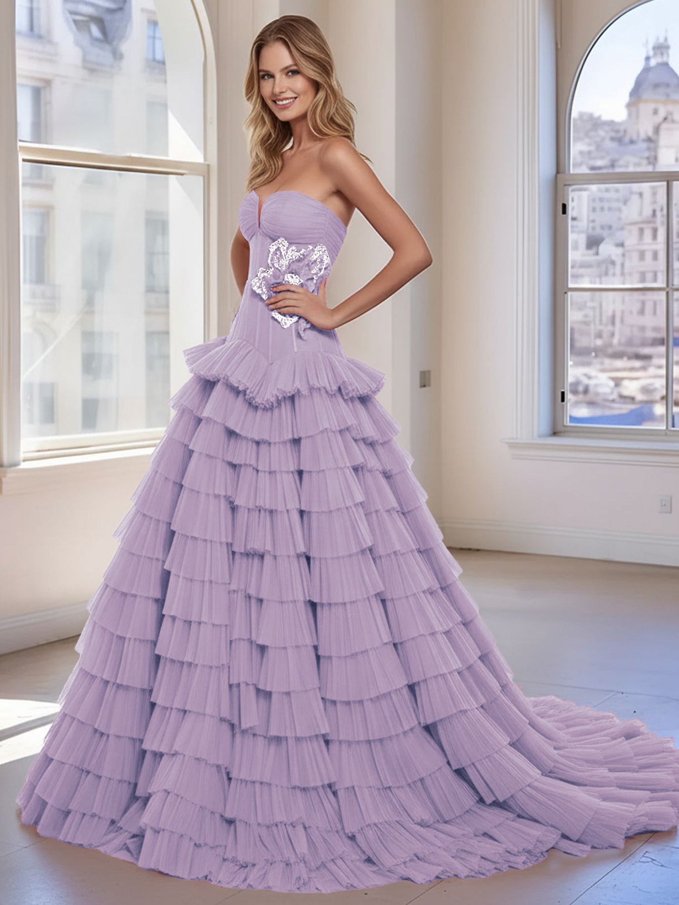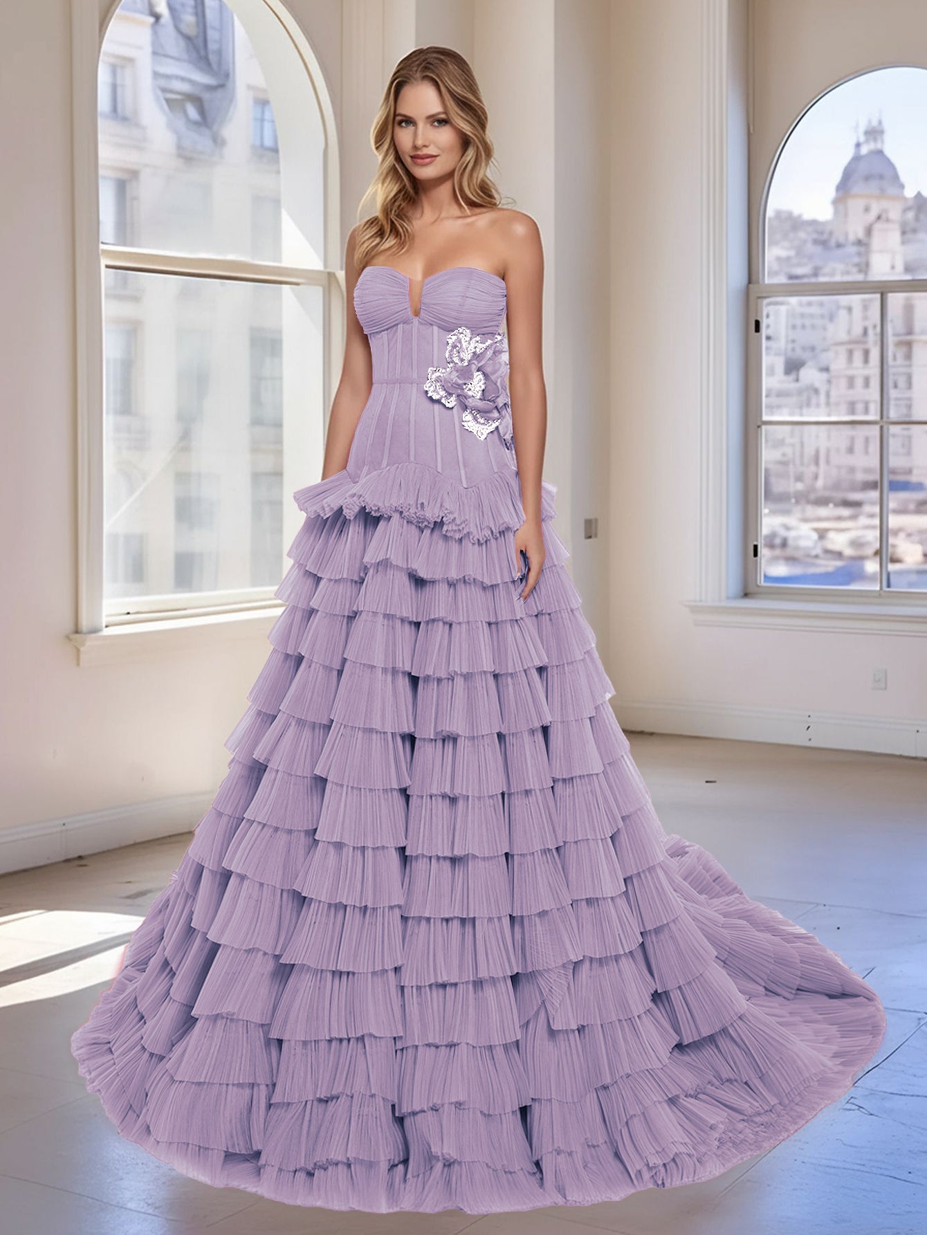 This lavender evening ball gown features tulle with 3d rose on the bodice. The strapless prom gown has a sweetheart neck and layered ruffle hem. This luxury dubai evening gown is ideal for party, evening or homecoming events.