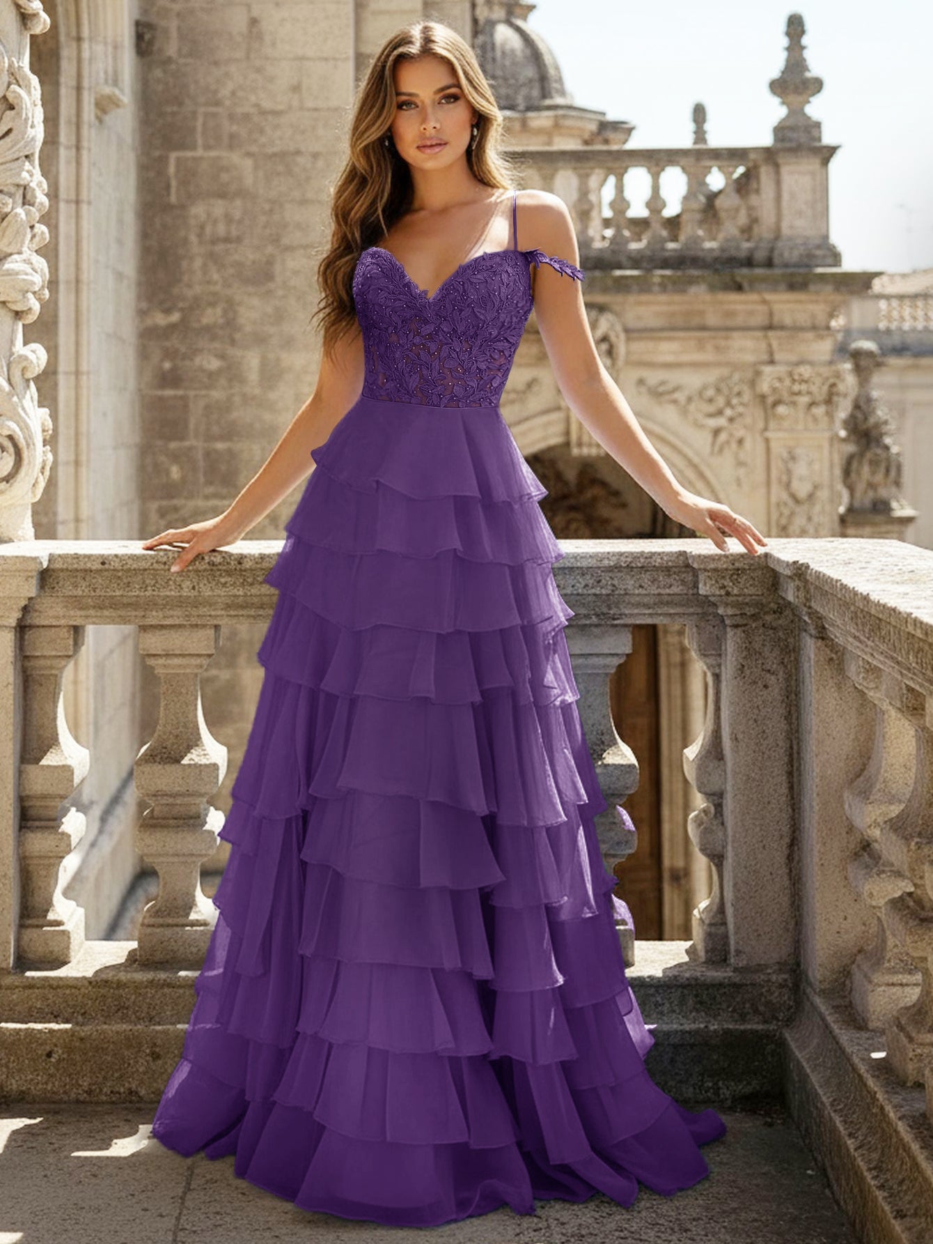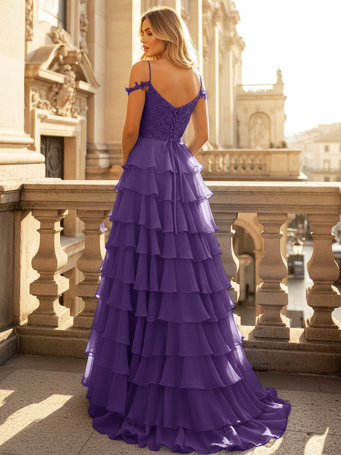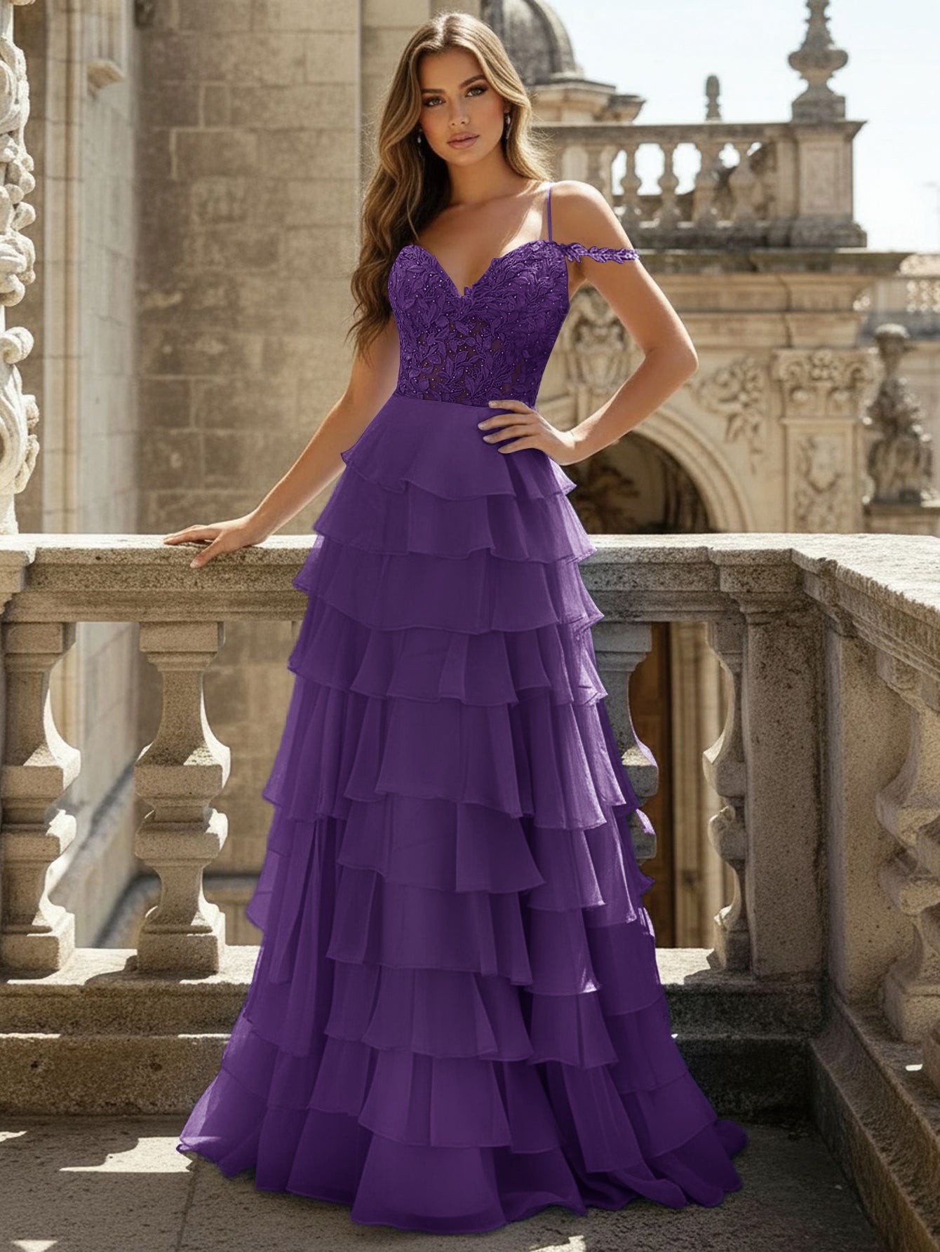 Lace Illusion Ruffle Tiered Ball Gown Prom Dress - Purple