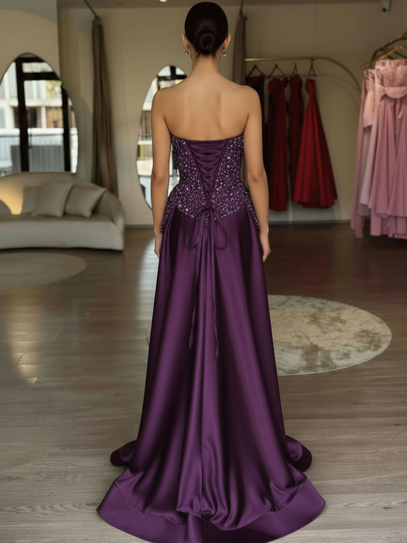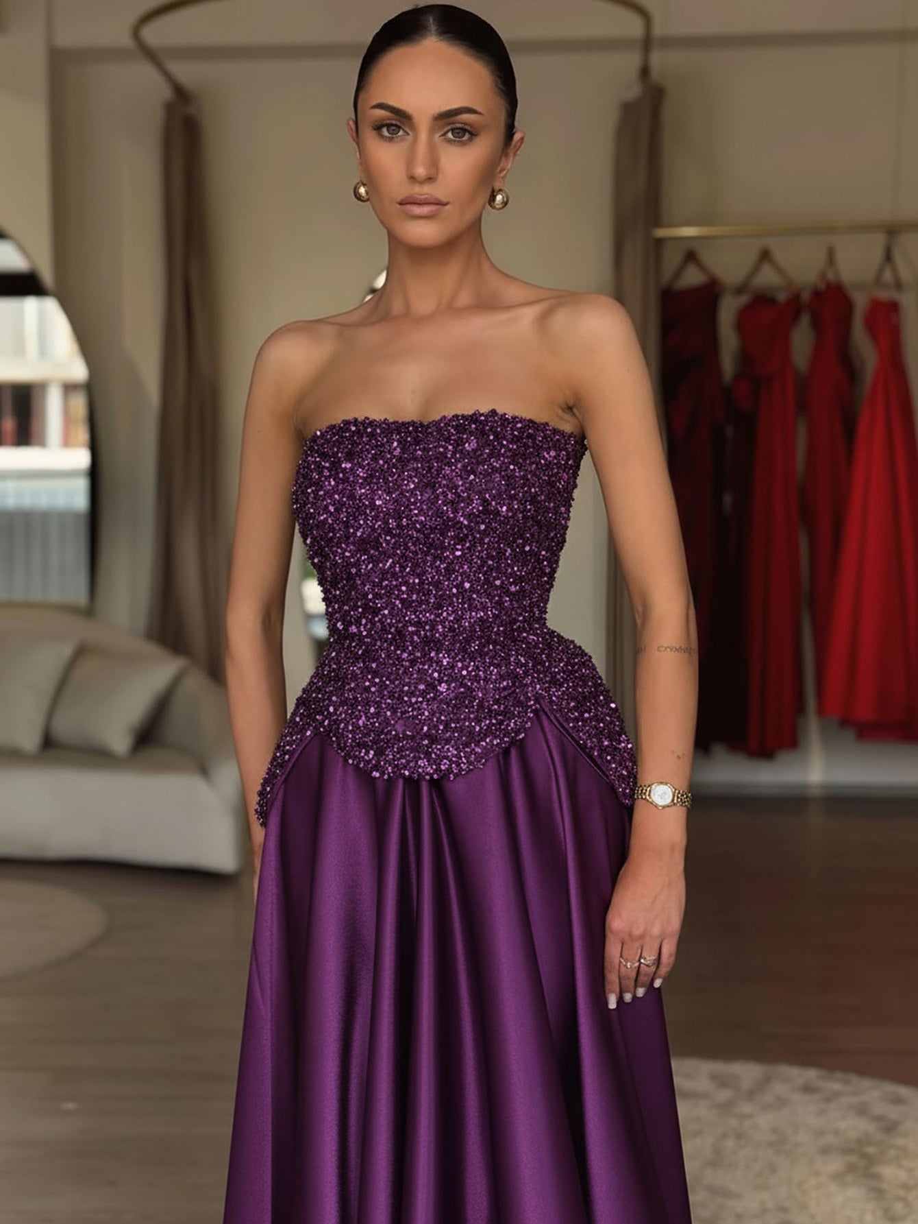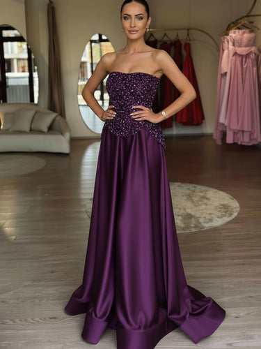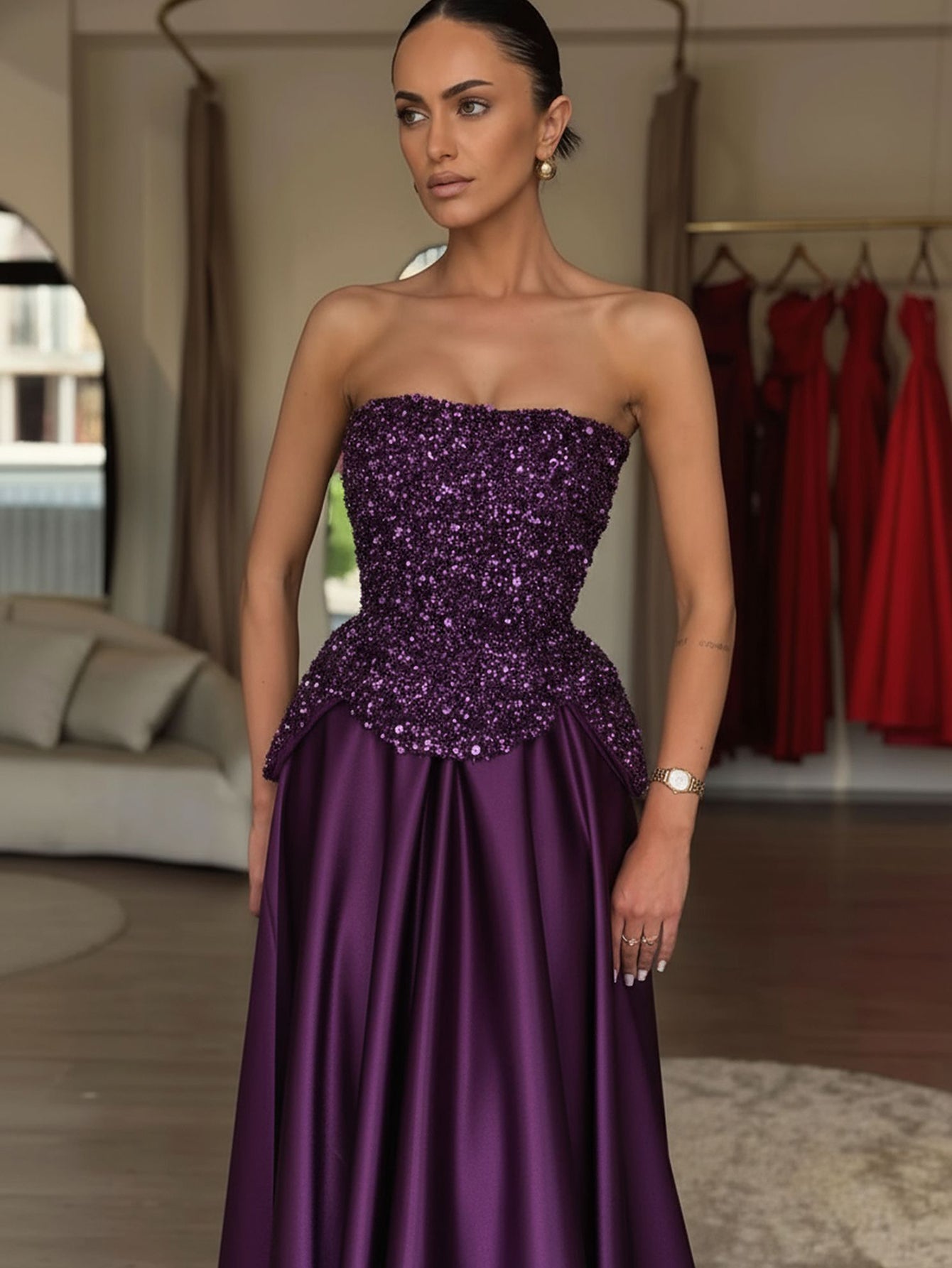 Luxury Two-Piece Sequin Top Satin Skirt Long Prom Dress - Purple