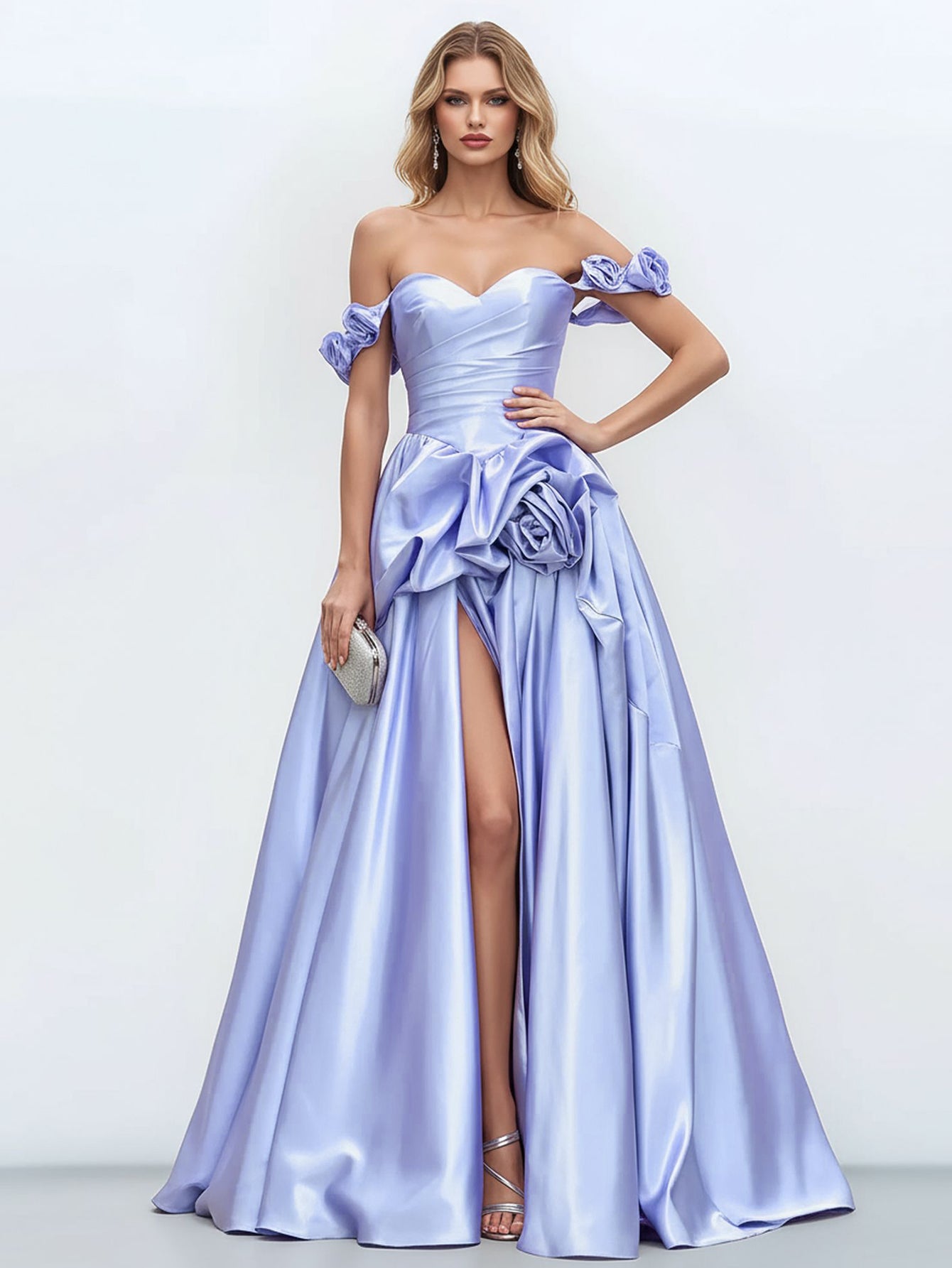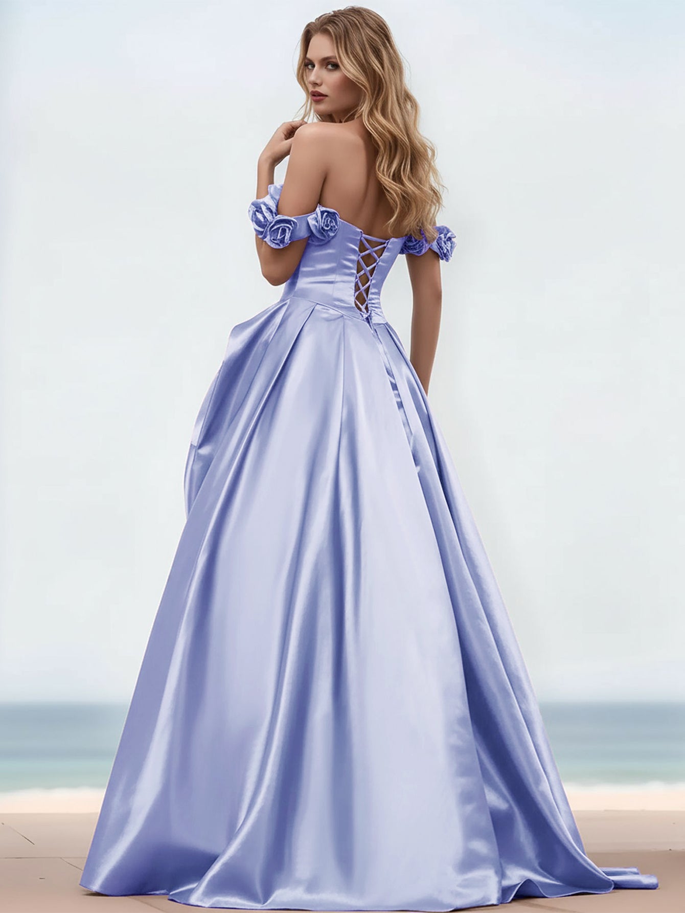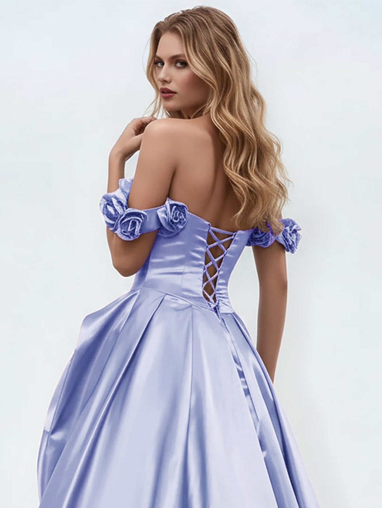 Off Shoulder 3D Rose Pick Up Satin Ball Gown Evening Dress - Lavender