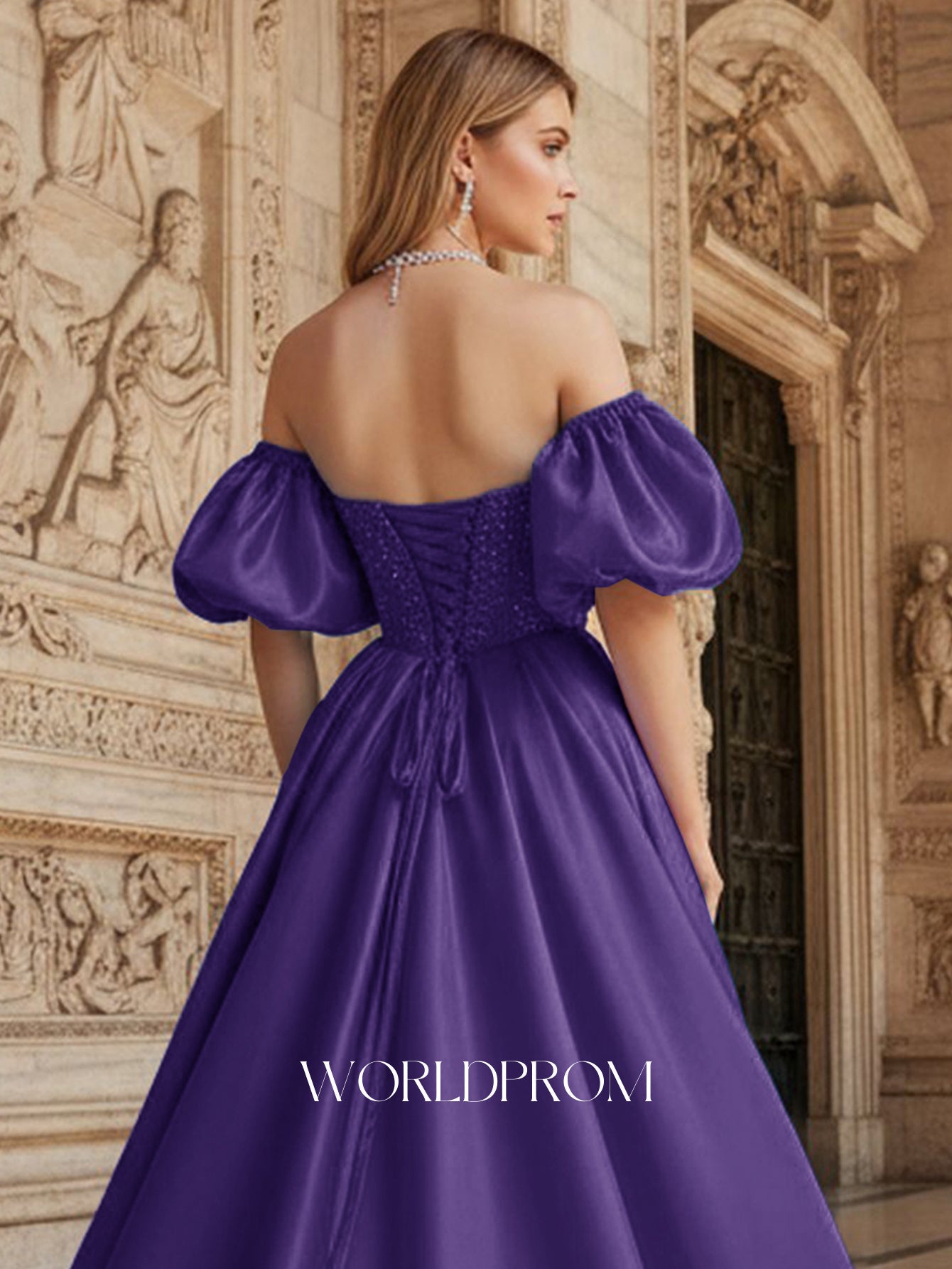 Off Shoulder Puff Sleeve Hot Fix Ball Gown Prom Dress - Purple
