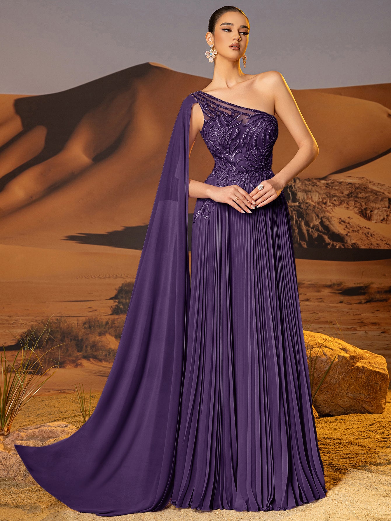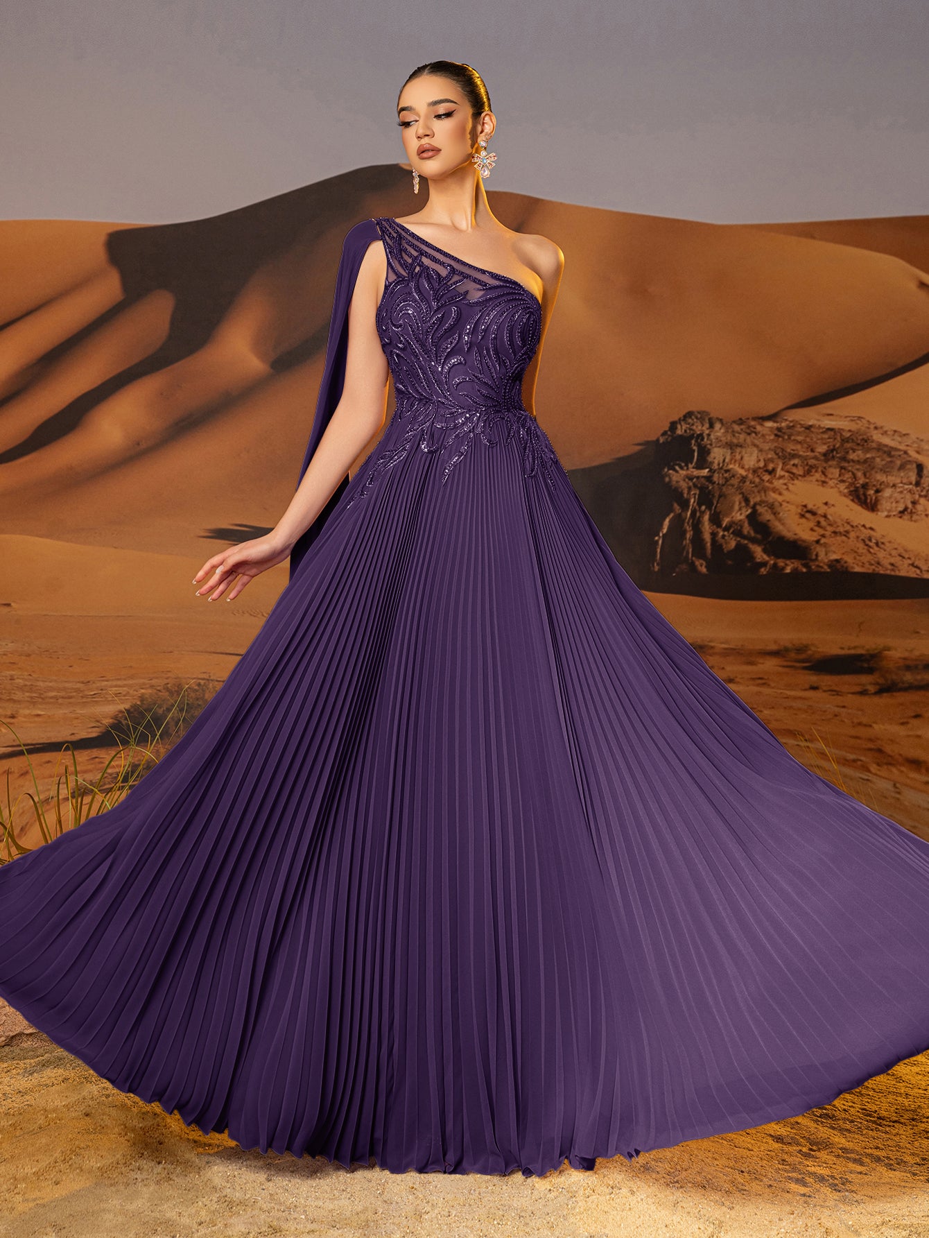 One Shoulder Beaded Pleats Long A-Line Prom Dress With Tulle - Purple
