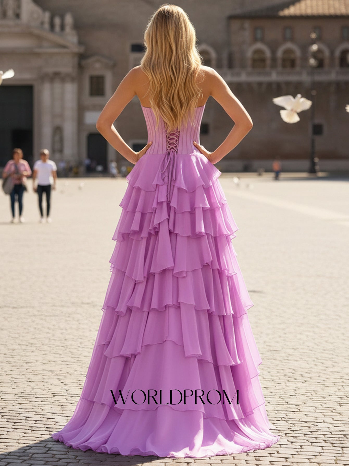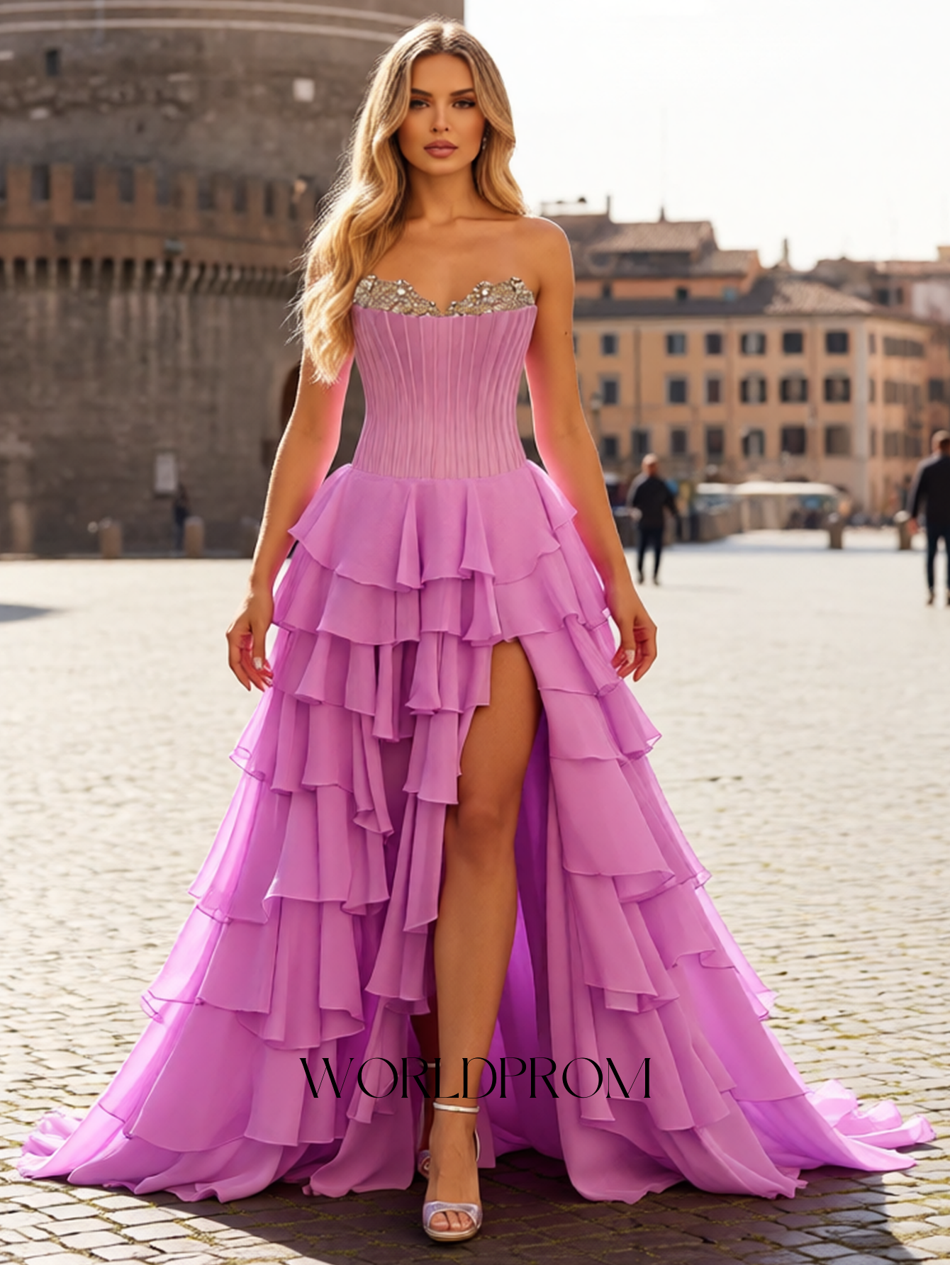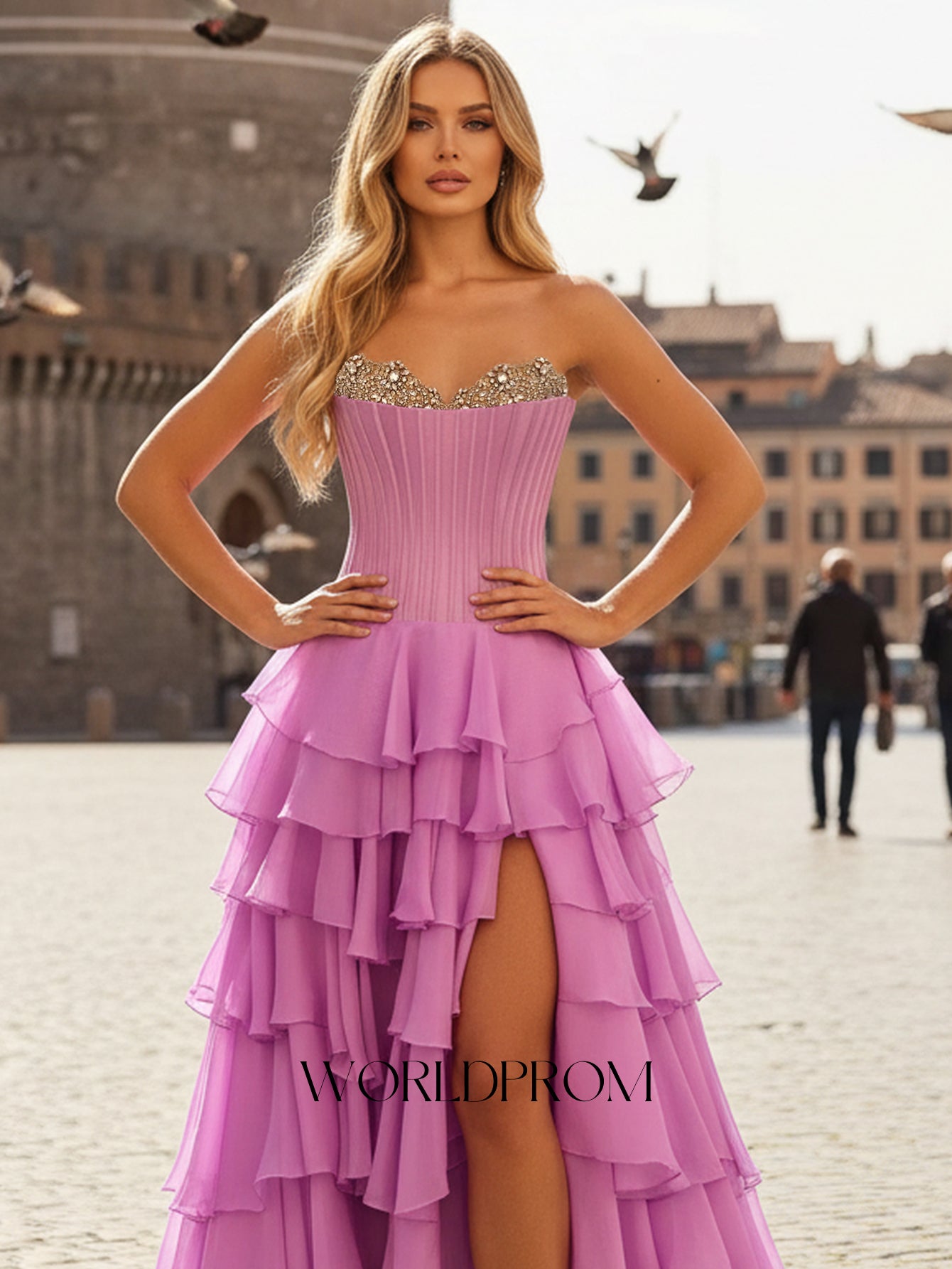 This chiffon prom gown features sparkly beading bust on the bodice. The strapless ruffled dress has a sweetheart neckline and split hem. Worldprom ball gown prom dresses are ideal for party, evening or festivals.