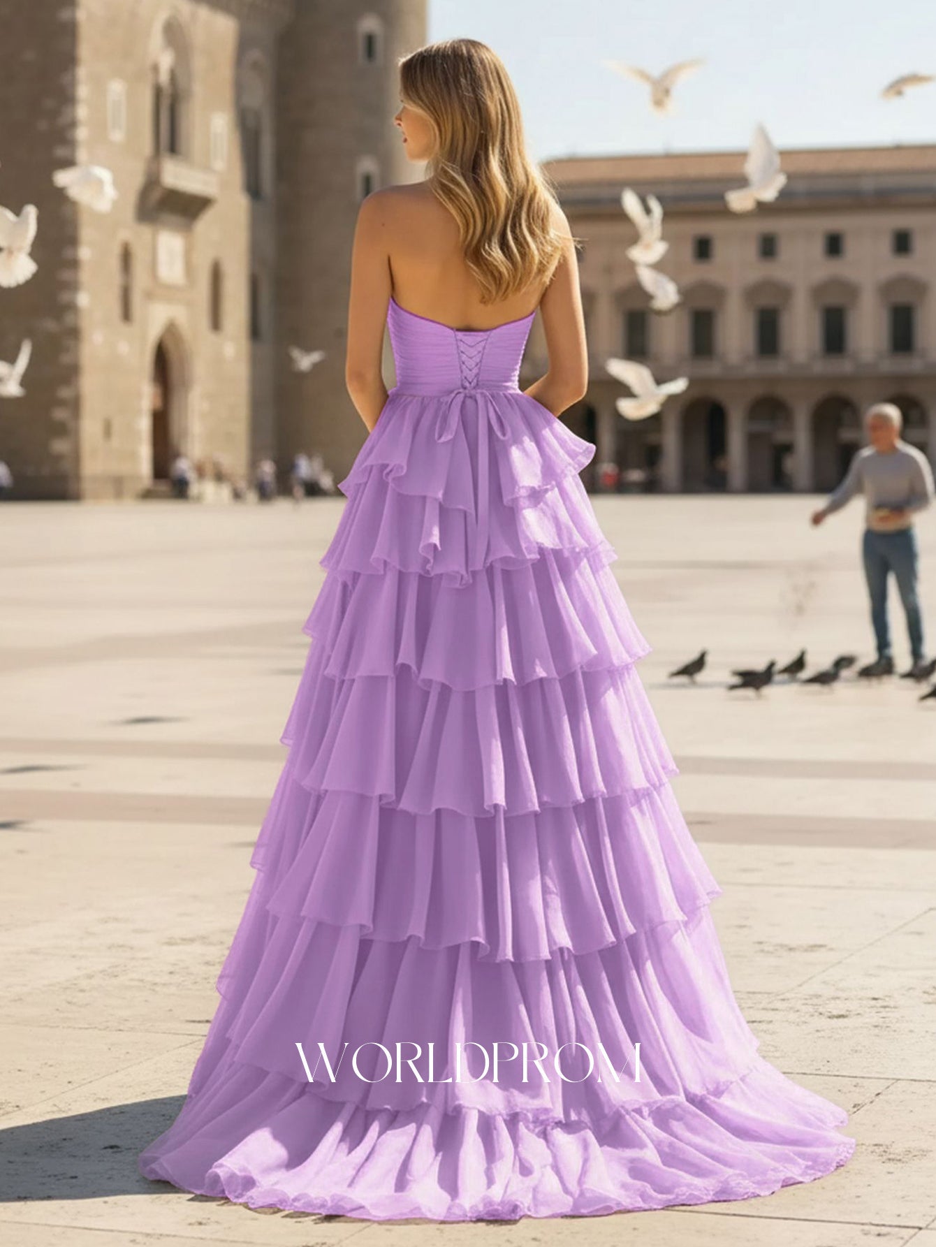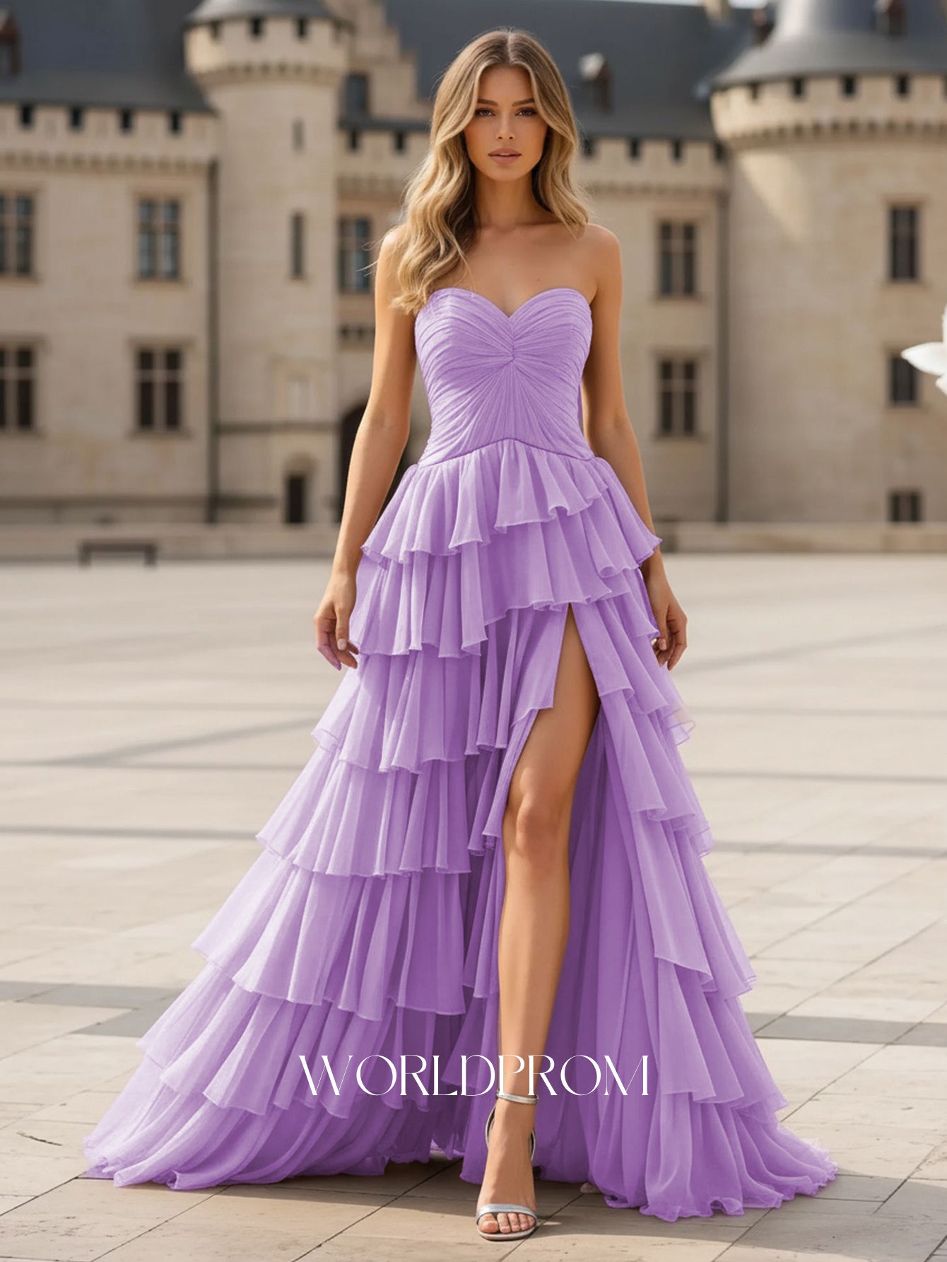 This tulle prom gown features ruched bust on the bodice. The strapless ruffled dress has a sweetheart neckline and split hem. Worldprom ball gown prom dresses are ideal for party, evening or festivals.