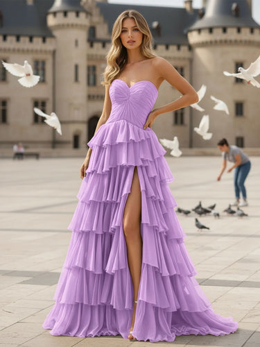 Sweetheart Ruched Bust Ruffle Hem Lace Up Long Ball Gown Prom Dress With Slit - Lilac