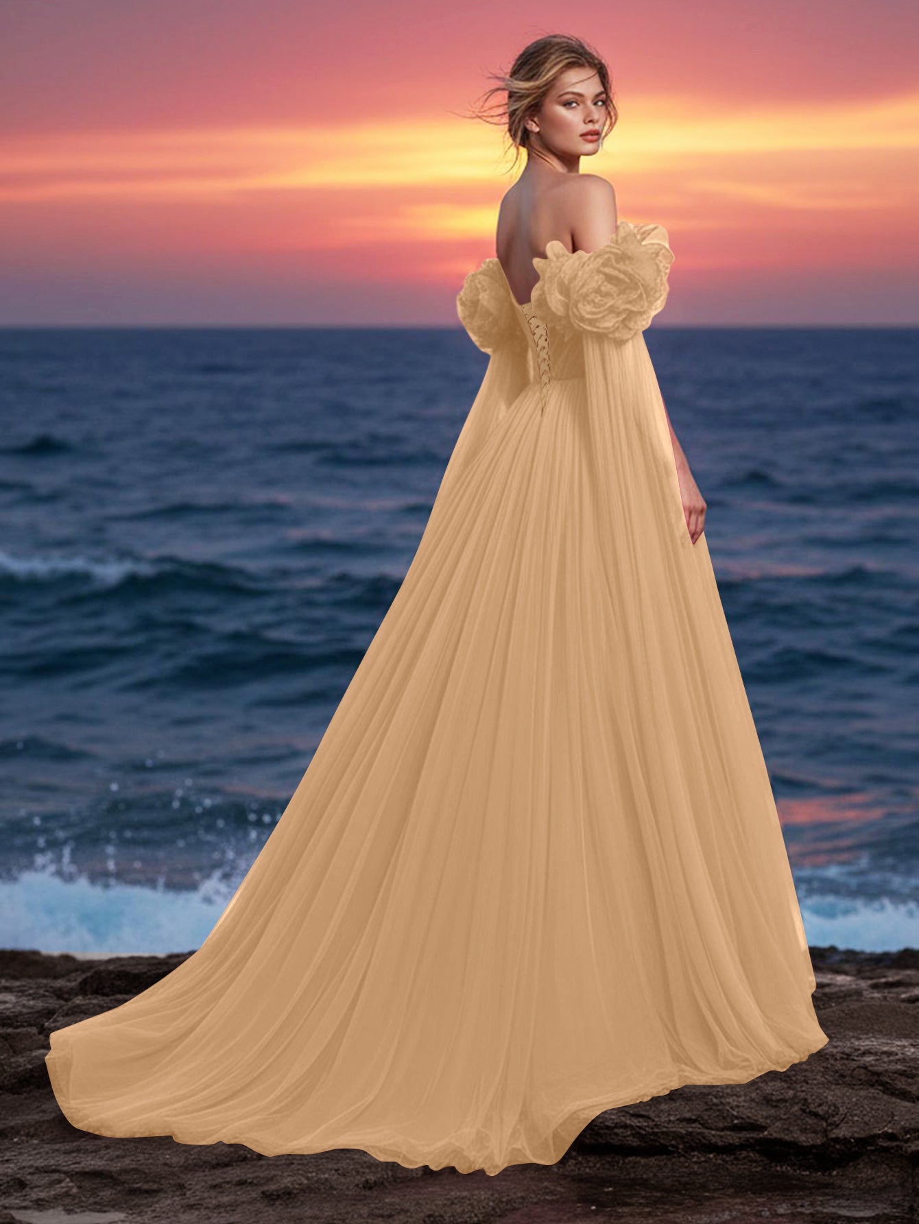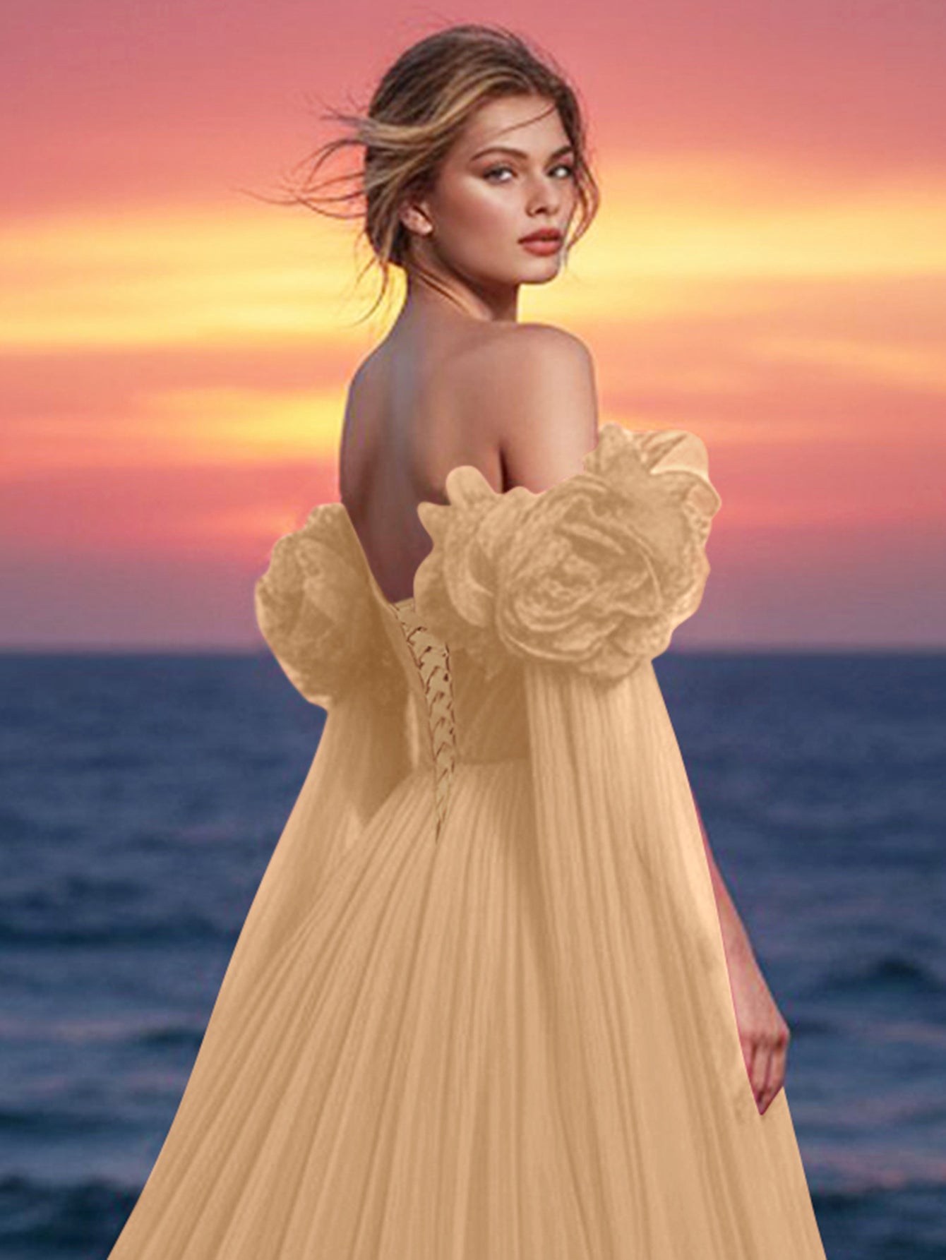 Off Shoulder 3D Rose Ball Gown Evening Dress With Long Sleeve - Champagne