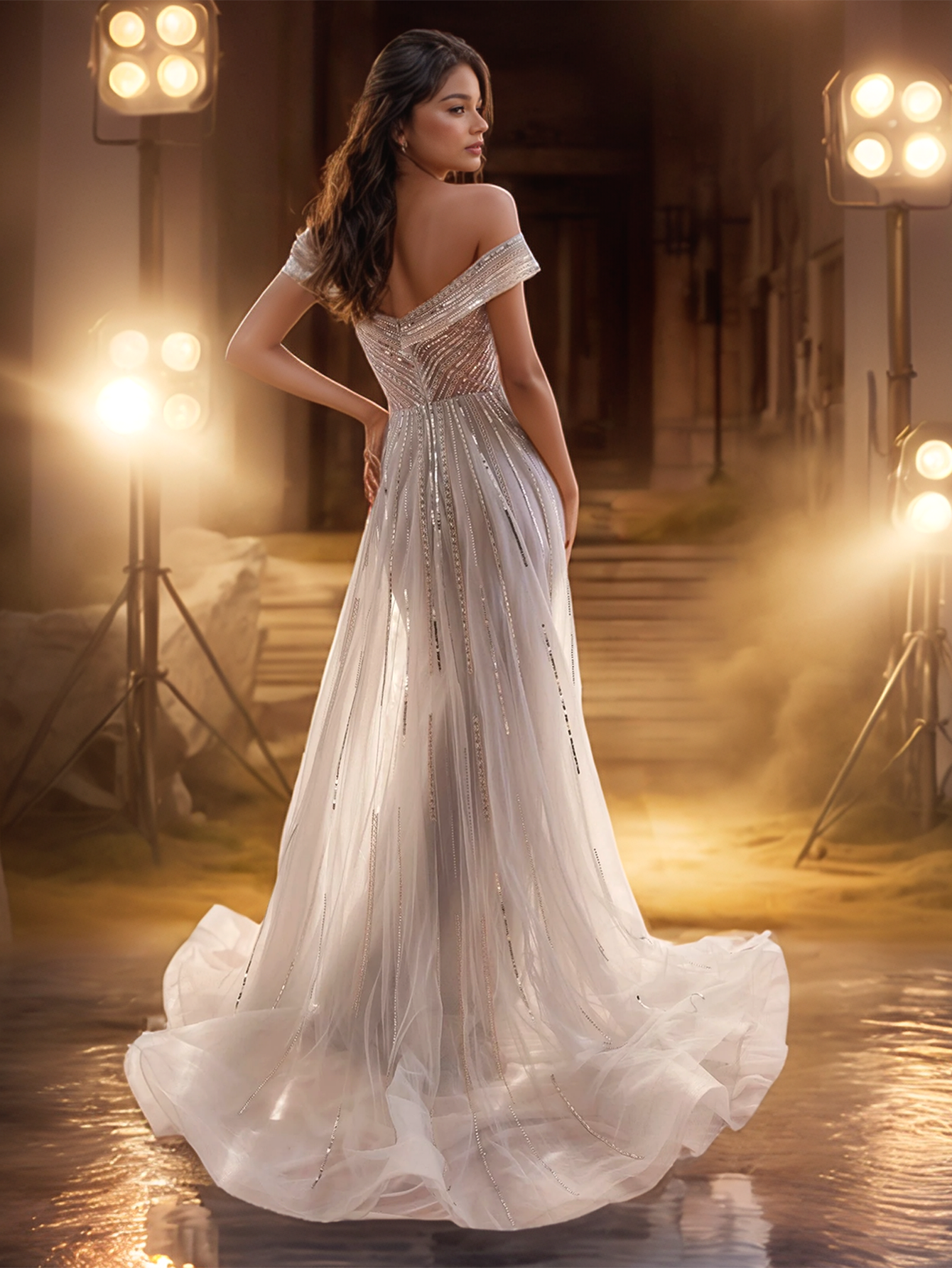 Off Shoulder Luxury Crystal Drop Waist Dubai Evening Dress - Champagne