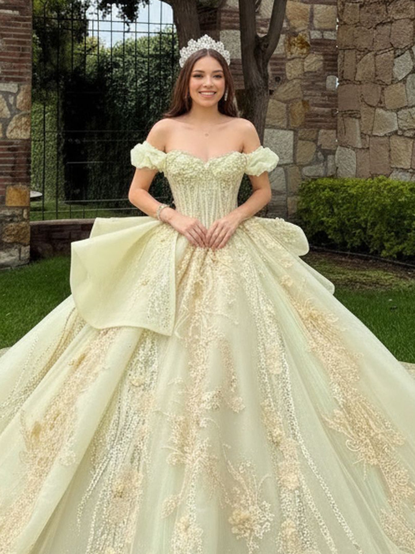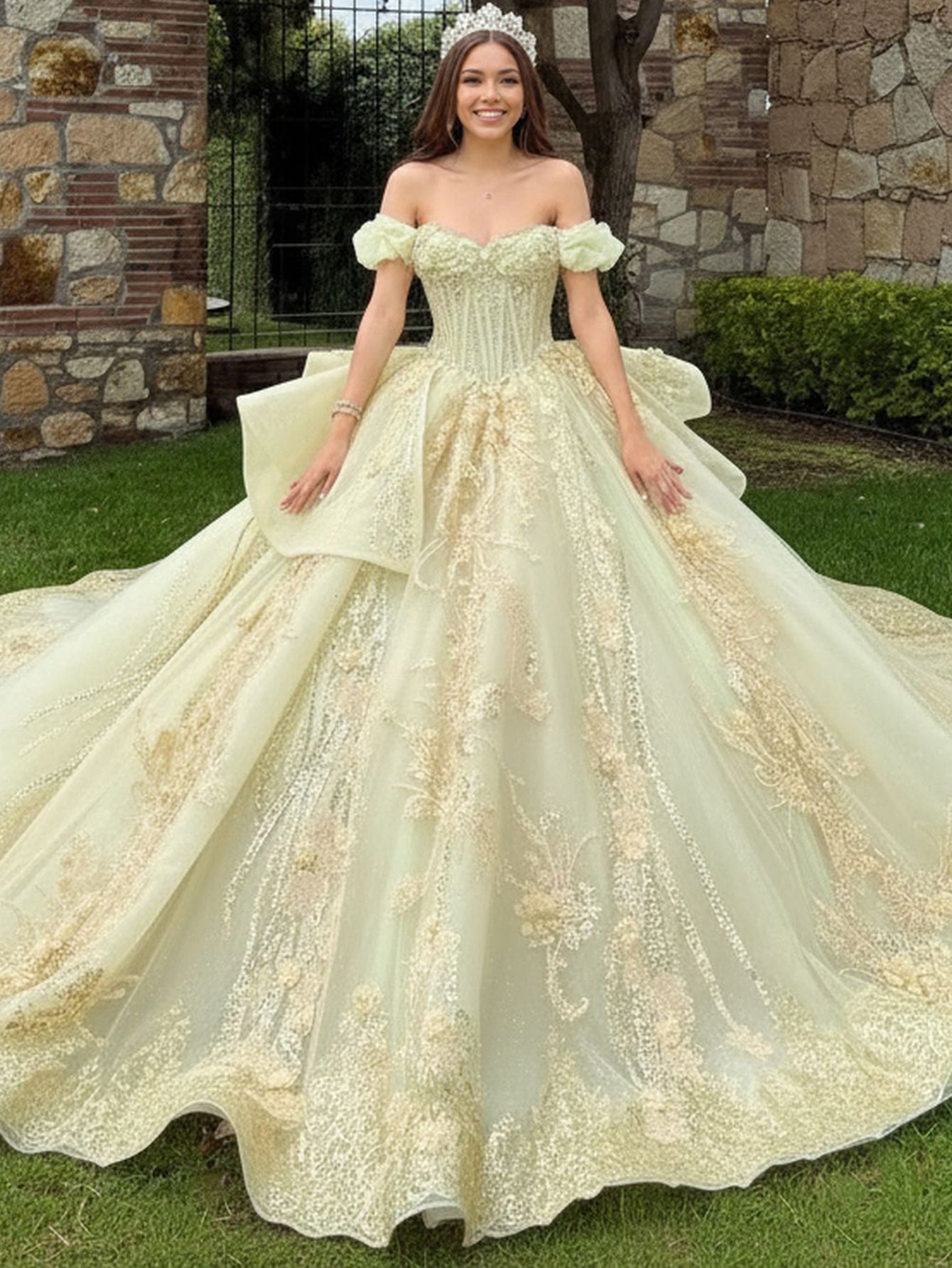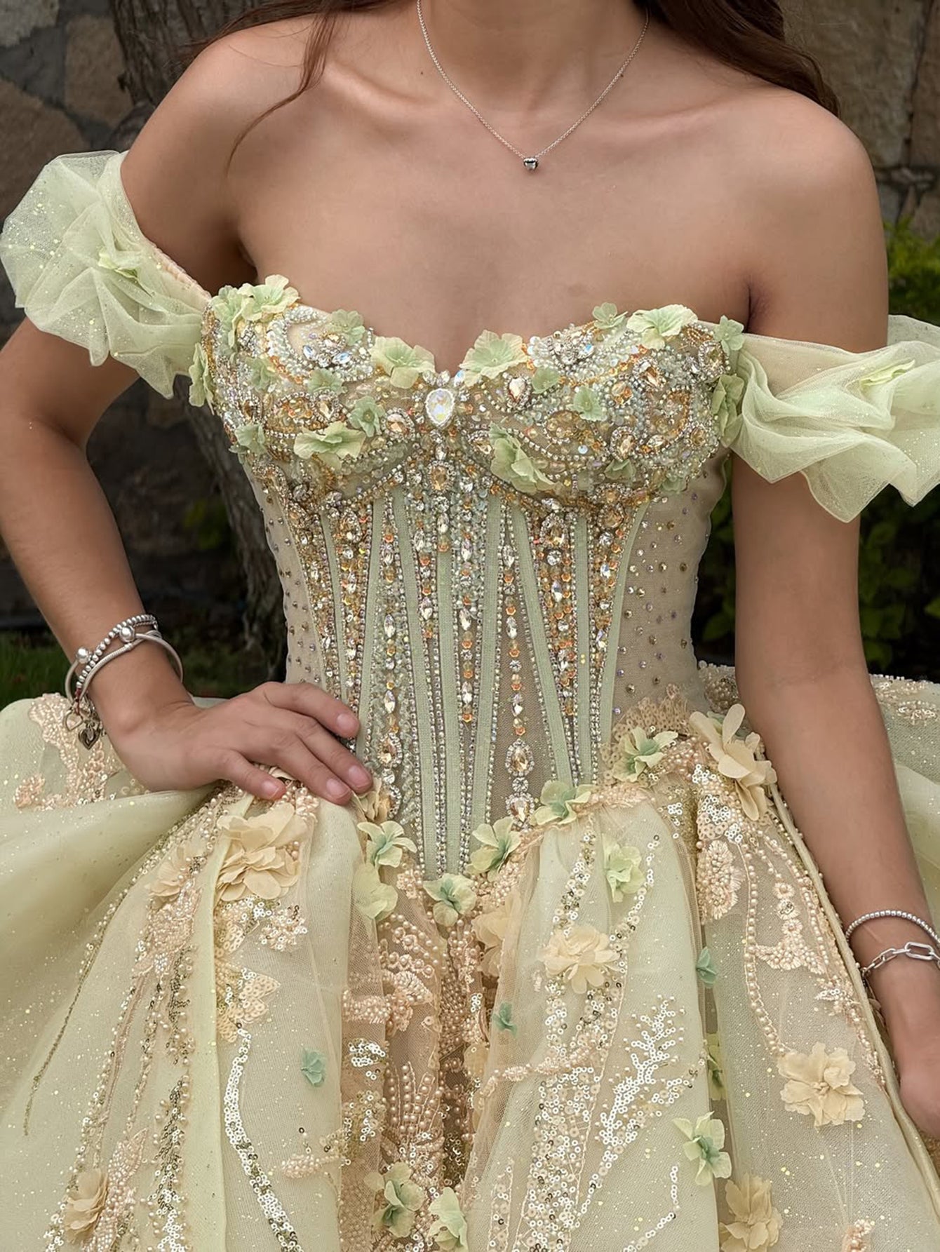 Sparkly Layered Crystal Off Shoulder Flower Embroidery Long Quinceanera Princess Dress - Yellow