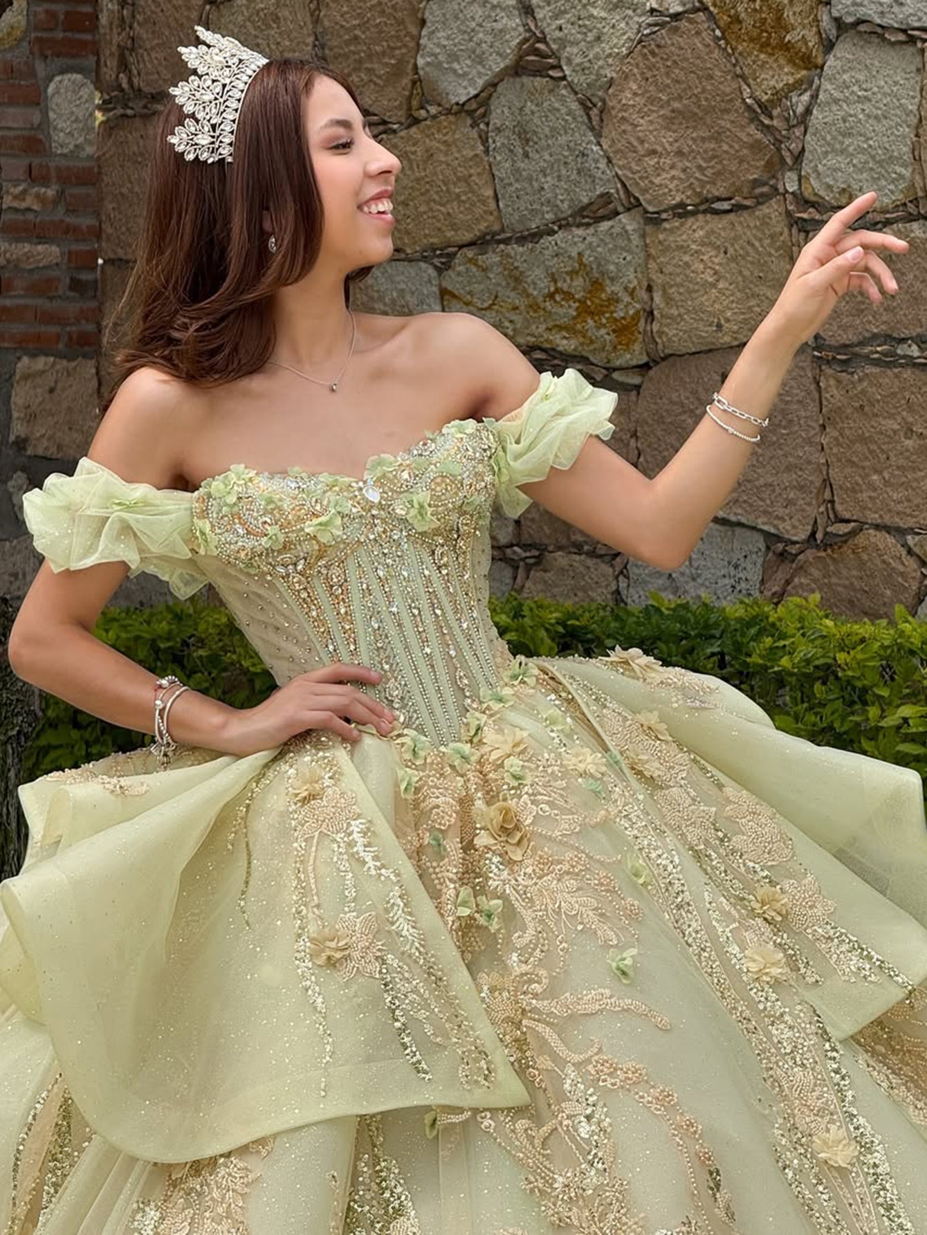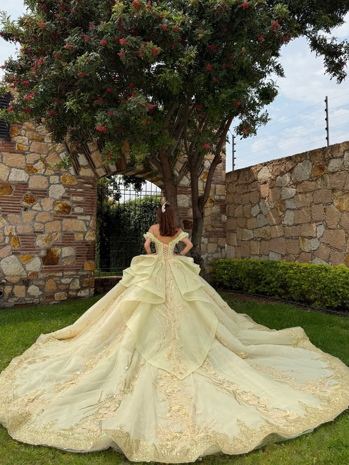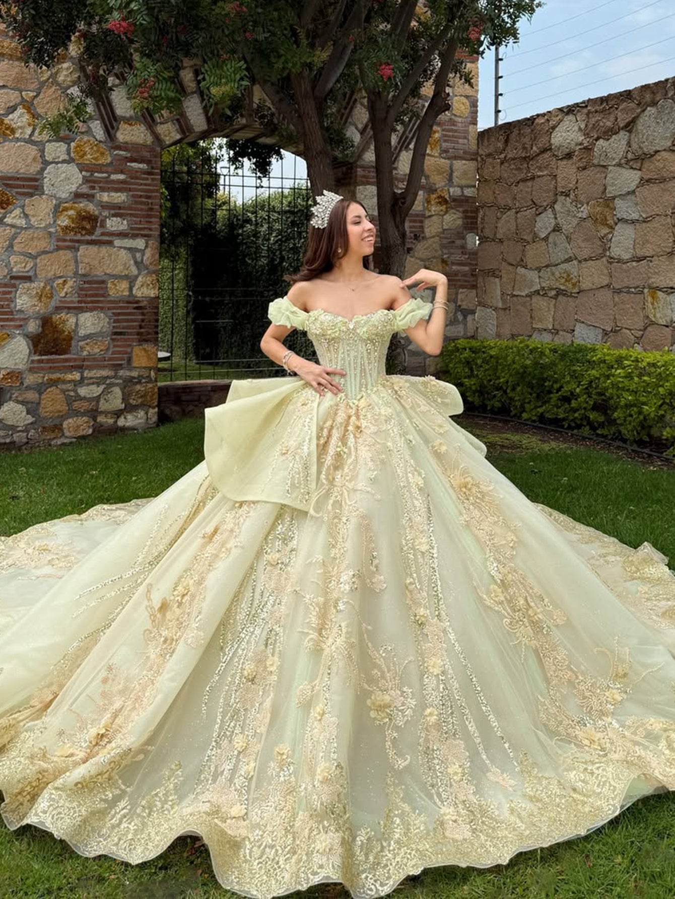 Sparkly Layered Crystal Off Shoulder Flower Embroidery Long Quinceanera Princess Dress - Yellow
