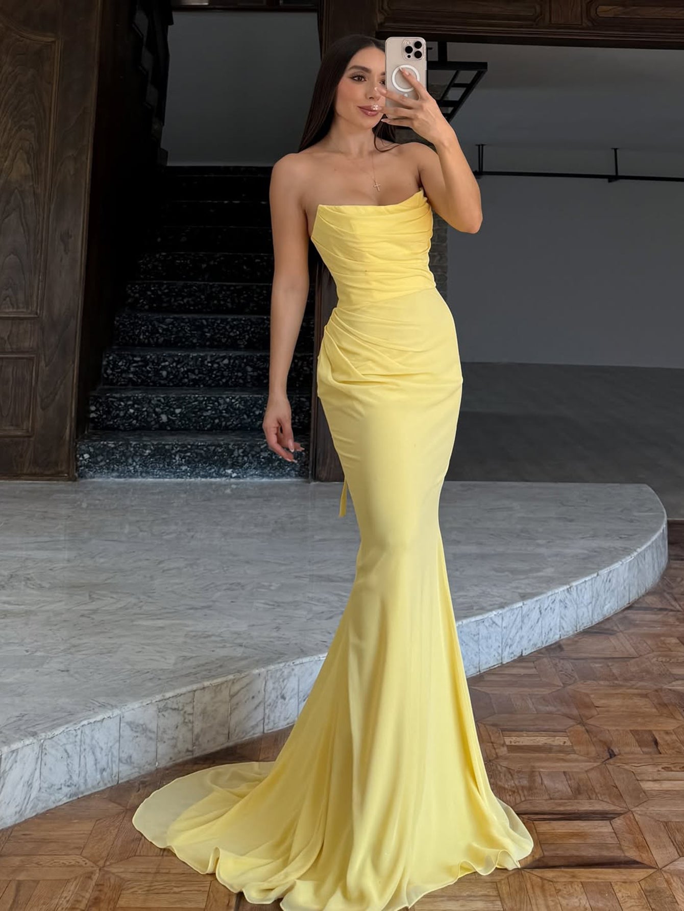 This chiffon prom gown features ruched bust on the bodice. The strapless maxi dress has a sheath hem. Worldprom mermaid prom dresses are ideal for party, evening or festivals.
