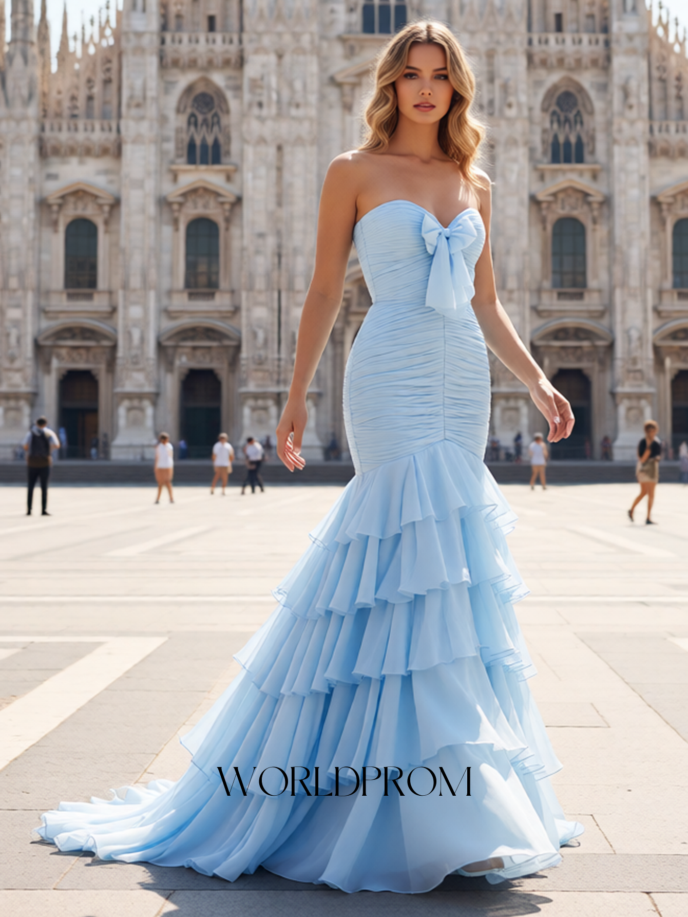 Bow Front Pleated Layered Ruffle Hem Mermaid Long Prom Dress - Baby Blue