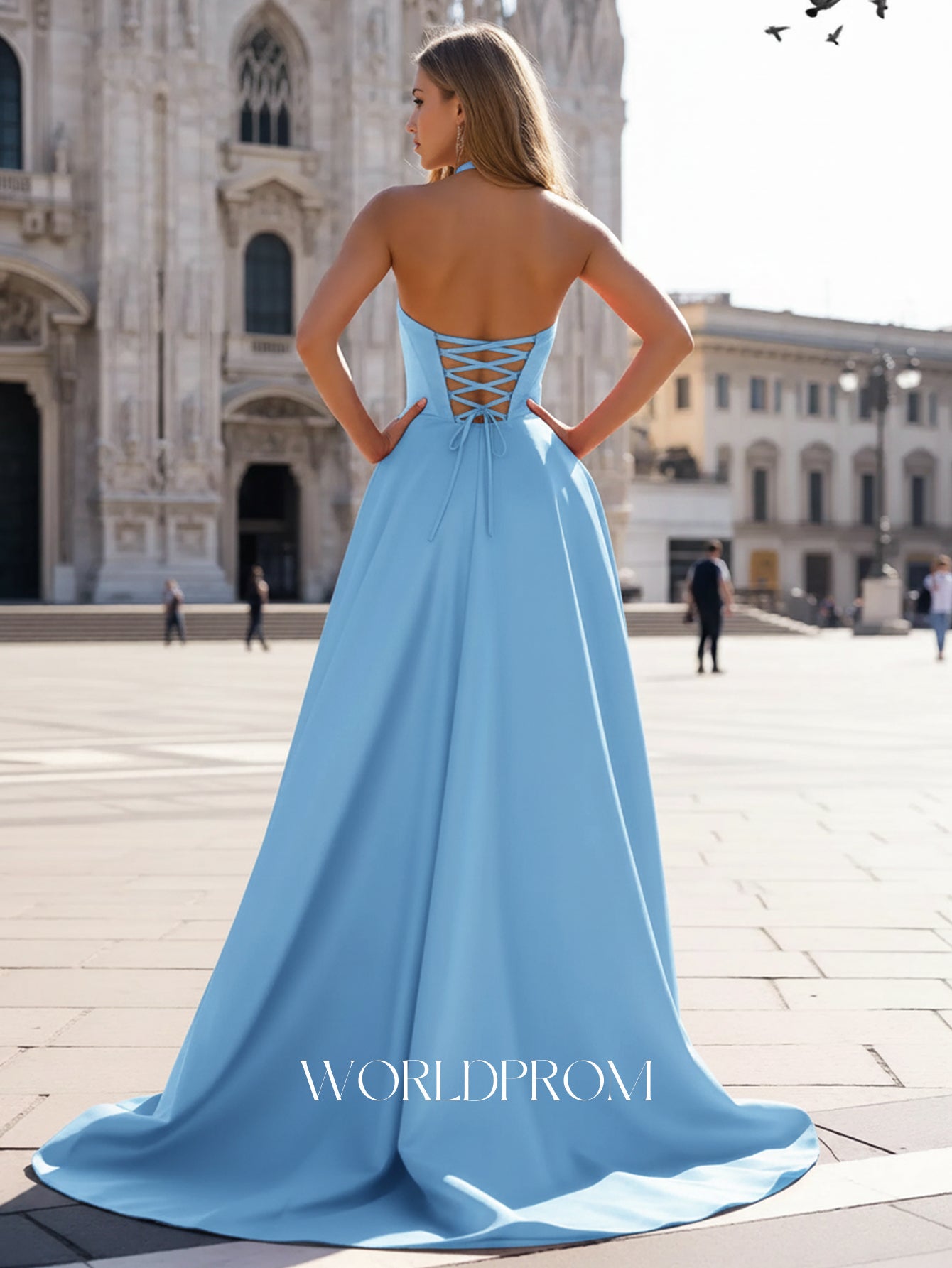 Halter Corset Pleated Backless A-Line Long Prom Dress With Pockets - Baby Blue