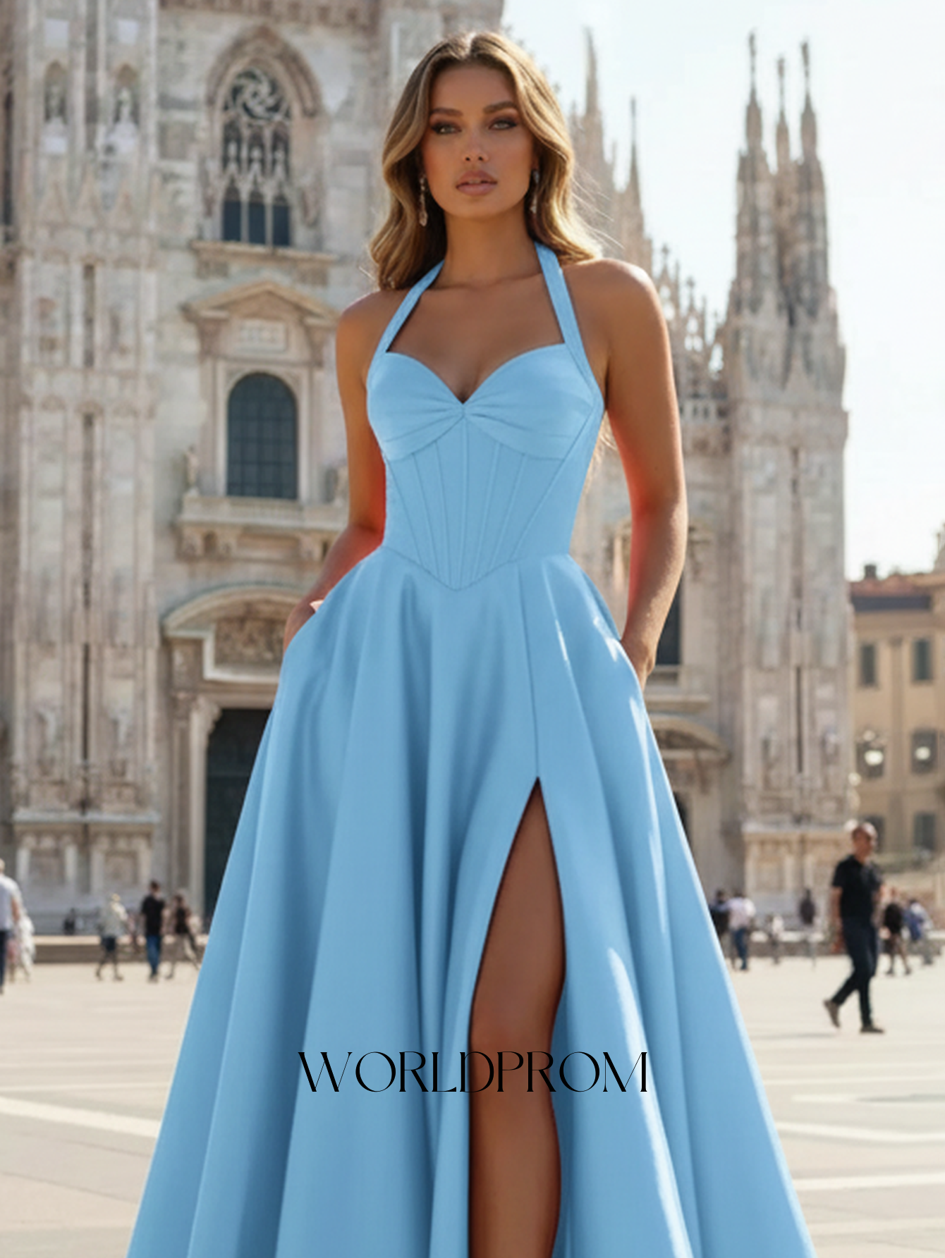 This satin prom gown features ruched bust with pockets on the bodice. The halter backless dress has a V-neckline and pleated split hem. Worldprom a-line prom dresses are ideal for party, evening or festivals.