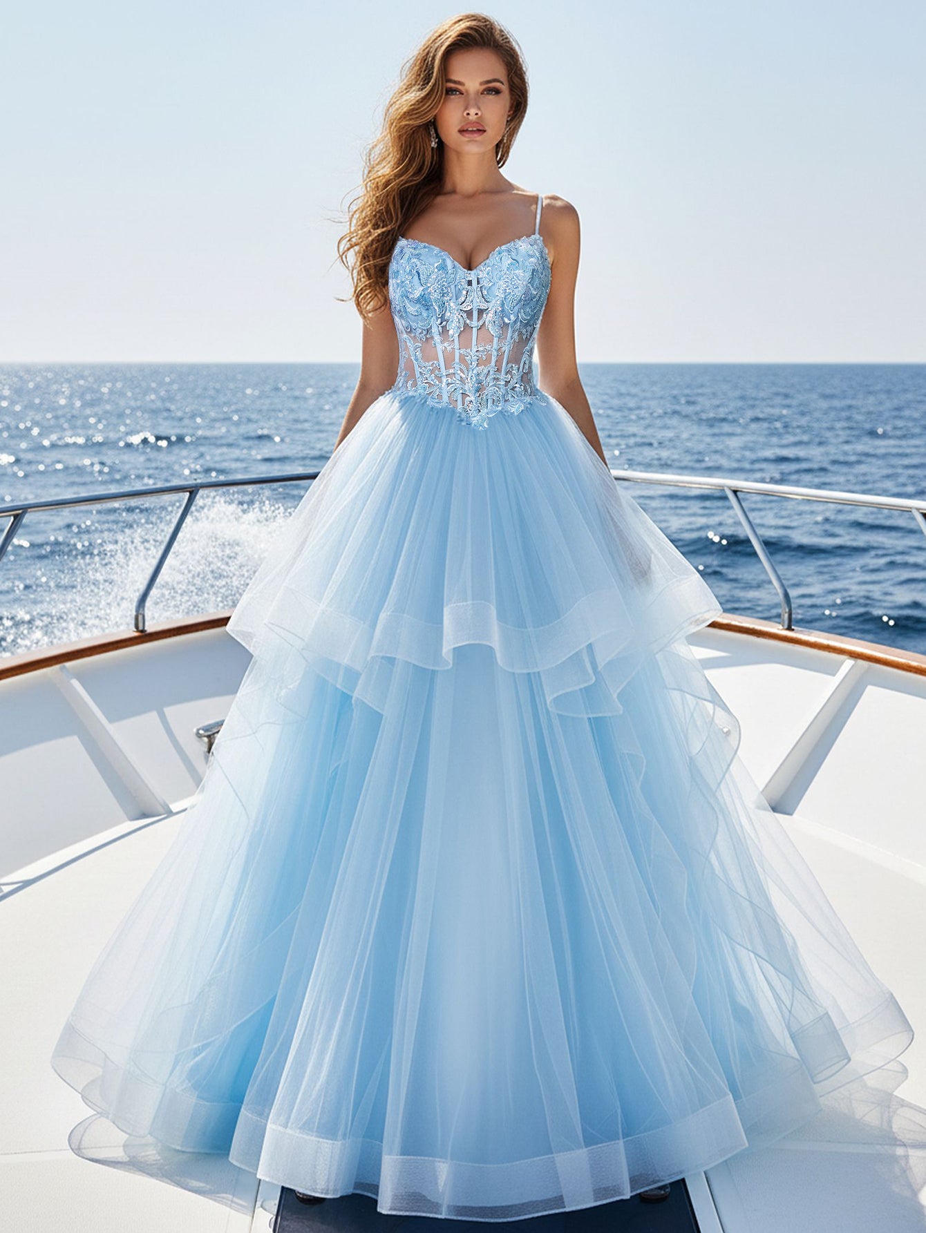 This prom gown features lace embroidery on the bodice. The spaghetti straps dress has a deep v-neck and tiered hem. This long formal dress is ideal for party, evening or festivals.